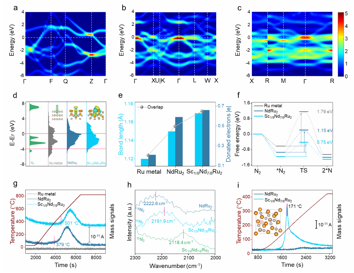 3.通过实验表征和理论计算证实,Sc1/8Nd7/8Ru2中Ru位点的d电子能级与N2分子轨道能级具有更好的匹配性,这有利于Ru与N2形成d-p轨道杂化,显著弱化N≡N键,该发现突破了传统电子富集作为活性描述符的固有认知,为催化剂理性设计提供了新思路。