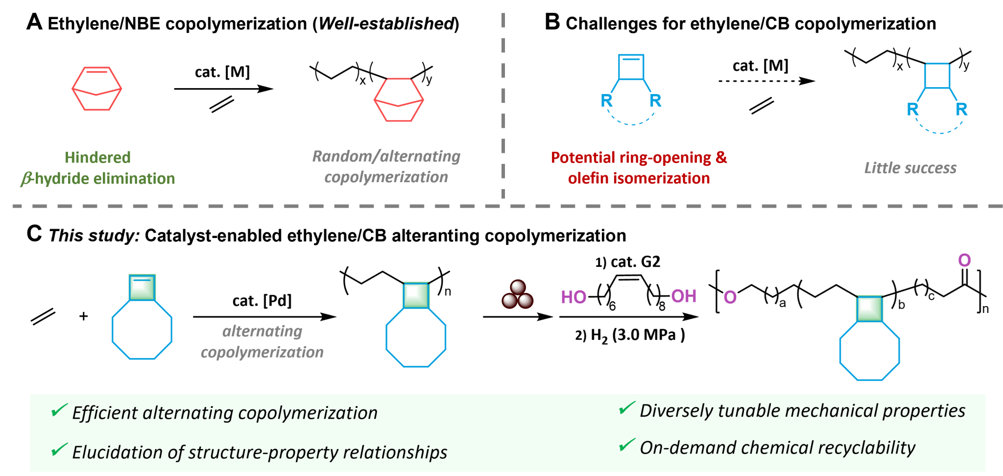 序列精确控制作为调控聚合物材料性能的关键策略,仍是一项具有重要基础意义但合成难度极高的挑战。尽管该策略为制备具有新颖性的功能化聚烯烃提供了巨大潜力,但相关研究进展十分有限。环烯烃共聚物(COCs)因含脂环单元而具备优异的热机械性能、高透明度和低介电常数。其中乙烯/降冰片烯共聚物已成为代表性的高性能材料(图1A)。尽管现有催化体系已实现多种张力环单体的交替共聚,四元环丁烯体系由于易发生开环和异构化等副反应,其与乙烯的共聚仍具有挑战性(图1B)。