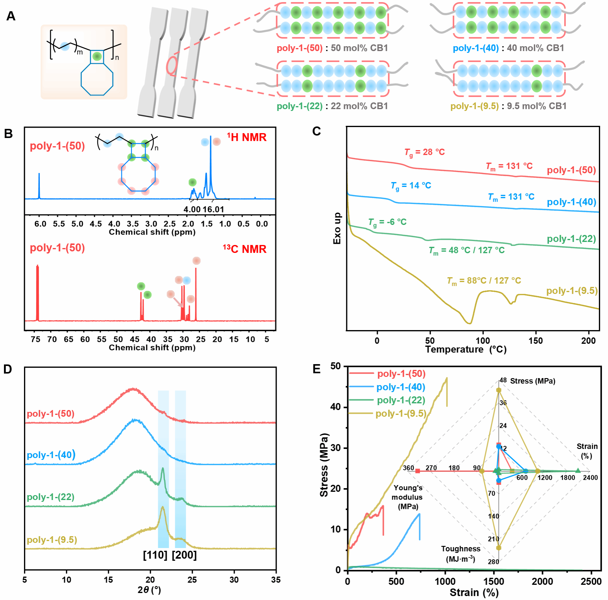 接下来,作者着重对于单体序列对乙烯/CB1共聚物性能的影响,进行了深入的探究。通过热分析与结构表征揭示了“组成-结构-性能”的内在关系。在热行为与结晶行为方面,随CB1含量从9.5 mol%增至50 mol%,共聚物的热行为发生显著转变(图3C)。低含量时出现双熔融峰(Tm由88 / 127 °C变为48 / 127 °C),并出现玻璃化转变温度(Tg= -6°C);高含量时仅显示单一Tg与Tm(poly-1-(50):Tg= 28°C,Tm= 131 °C)。通过WAXD测定表明,CB1含量的增加显著破坏聚乙烯结晶区(图3D):结晶度从40%(9.5 mol%)急剧降至16%(22 mol%),更高含量时(40 – 50 mol%)结晶完全被抑制,材料呈现非晶态。对于微结构存在形式,作者基于聚合动力学与多种表征提出CB1单元沿分子链均匀分布,无明显二聚序列(图3A)。低含量时聚乙烯长序列形成结晶域,与CB1插入单元共存;高含量时交替序列主导结构,形成弱结晶/非晶态。随后进行的单轴拉伸测试表明(图3E),CB1含量与序列分布能够显著影响其力学行为:poly-1-(9.5)会表现弹性体行为,强度42.7 MPa,断裂伸长率1025%;poly-1-(22)由于链堆叠松散,强度降至0.8 MPa,伸长率显著提高至2085%;poly-1-(40)及poly-1-(50)存在的近交替序列赋予材料规整性与弹性体特征,强度13.0 – 13.8 MPa,且poly-1-(50)表现出典型半结晶聚合物变形行为。