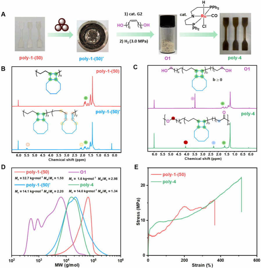 最后利用双环[6.2.0]癸烷单元的力响应特性,实现了交替共聚物poly-1-(50)的本体活化与升级回收(图5A)。先通过球磨处理,实现了20%的环丁烷开环率,得到具有C=C的中间体poly-1-(50)′(图5B)。¹H NMR检测到5.45 ppm处烯烃信号及链末端甲基信号增强,证实了力活化过程中同时存在开环与链断烈。对比实验表明,poly-2-(41)也可发生类似开环(开环率13%),而poly-3-(42)仅发生非特异性链断裂,凸显了双环环丁烷独特的机械力响应性。在随后的化学升级回收中,将含C=C的中间体与生物基1,16-二醇进行交叉复分解降解,经氢化得到双端羟基的低聚物O1(图5C),再通过Ru-MACHO催化剂催化的脱氢聚合,能够高效再聚合为聚酯poly-4((图5C)。与原料相比,poly-4因引入长烷烃链段,结晶性提高,表现出更高强度与断裂伸长率,且具有84°C的熔融温度(图5E)。从而为聚烯烃材料的本体力活化与化学循环提供了新方法,并展示了从机械力响应到材料再制造的闭环回收路径。