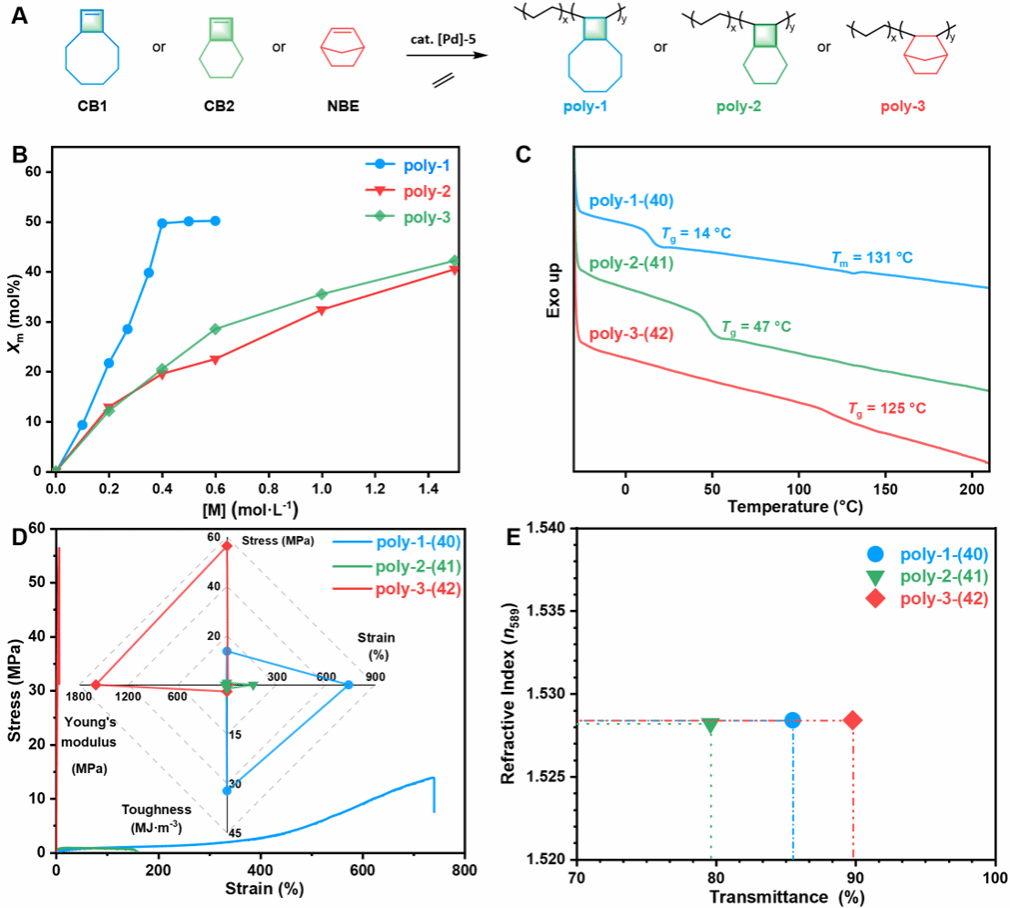 本研究开发了一种钯催化体系([Pd]-5),实现了乙烯与双环环丁烯单体的高效交替共聚,成功制备出主链具有高含量双环环丁烷的机械力响应性功能化聚烯烃。通过调节单体浓度,可实现共聚物序列从无规到交替的可控调控(CB1-Xm: 9.5–50 mol%),并成功获得CB1-Xm= 50 mol%的完美交替共聚物。研究结果显示,从无规到交替序列的转变显著影响共聚物的热行为与力学性能;稠环结构对调控热机械性能起到关键作用。近交替结构的乙烯/CB1共聚物在保持与乙烯/降冰片烯共聚物相当光学性能(透光率与折射率)的同时,显著提高了材料韧性,为传统环烯烃共聚物提供了新的替代材料。此外,利用交替共聚物中环丁烷的机械力响应性,通过本体球磨可发生选择性环化逆反应,生成含C=C双键的不饱和聚合物。该双键可与生物基十六碳烯二醇进行交叉复分解反应,生成双端羟基官能化低聚物,进而通过脱氢缩聚实现材料的化学升级回收,形成闭环循环路径。