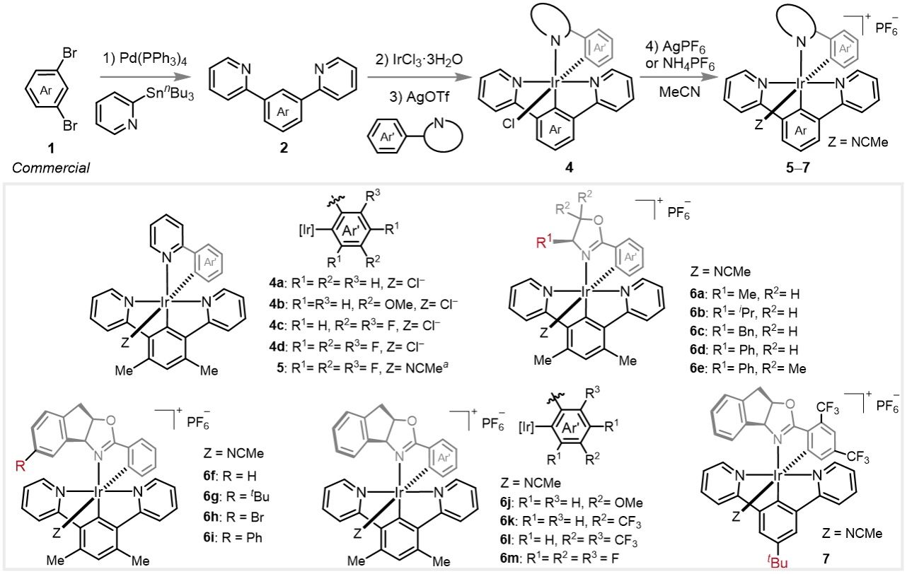 易于制备和修饰:该催化剂以金属铱(III)为核心,结合了N^C^N型三齿螯合配体、C^N型双齿螯合配体以及易解离的单齿配体。其合成路径简洁,从商品化原料出发,通过四步线性反应即可高效制备。由于三齿和双齿配体均为易获取的常规配体,催化剂的电子性质和结构易于修饰,具有较高的灵活性和可调控性。