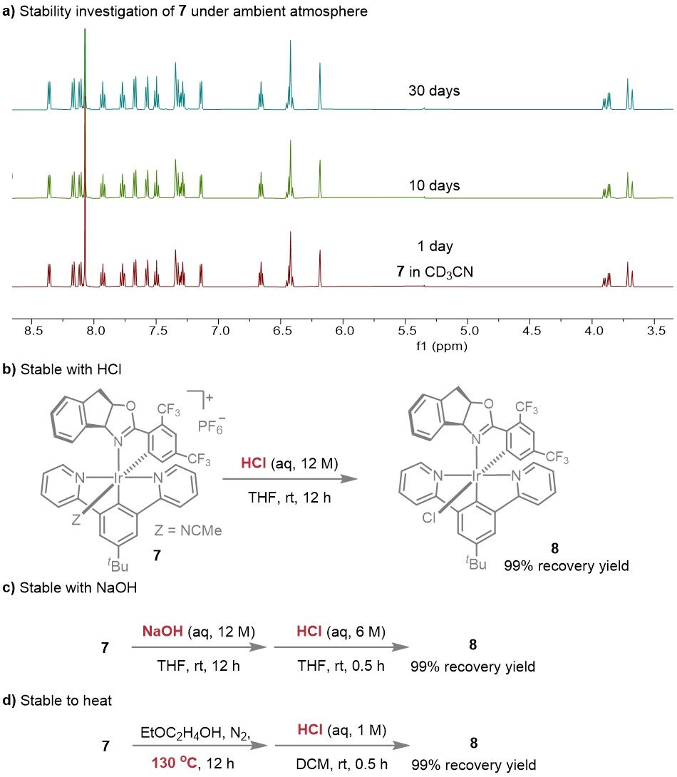 接下来,研究团队对所得络合物的热力学稳定性进行了评估。核磁共振氢谱(1H NMR)结果显示(图3a),络合物7在CD3CN中可保持结构不变超过30天,表现出优异的稳定性。此外,使用浓盐酸(12 N)、浓氢氧化钠(12 N)处理,或在130 °C高温下加热处理,络合物7均能被定量回收(图3b-d)。以上结果表明,络合物7具有优异的热力学稳定性。