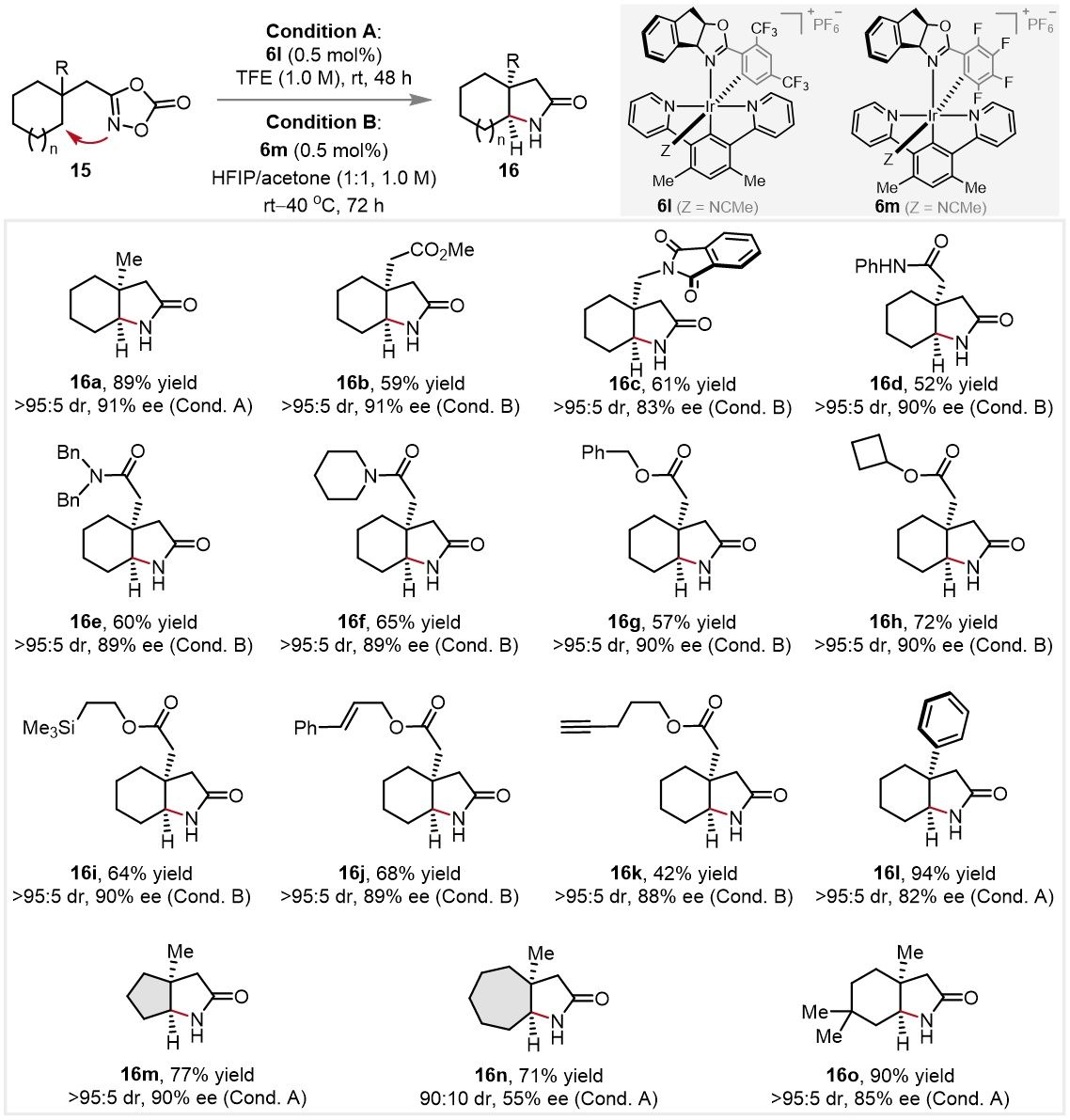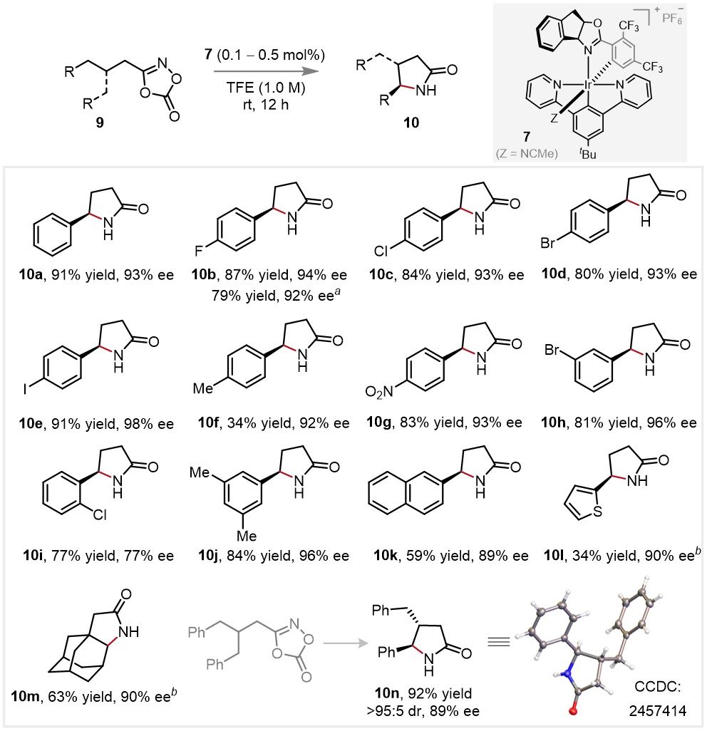 基于这类新型手性Ir(III)催化剂,研究团队不仅高效实现了多种取代γ-内酰胺的不对称合成(图6),更在构建含全碳季碳手性中心的八氢吲哚骨架方面取得重要突破(图7)。通过去对称化策略,该反应成功合成了一系列手性八氢吲哚酮衍生物,为复杂手性杂环分子的构筑提供了有力工具。