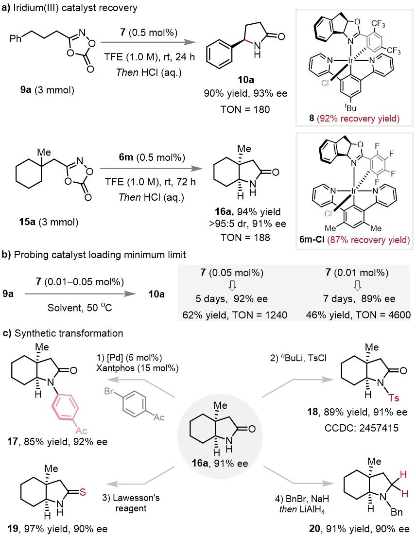 基于铱(III)络合物优异的稳定性,研究团队进一步开展了催化剂回收实验。如图8a所示,反应结束后,手性铱(III)络合物7和6m经盐酸溶液处理,可分别以中性形式的8和6m-Cl高效回收。此外,在催化剂负载量降至0.01 mol%的条件下,仍可实现46%的收率和89%的对映选择性,对应TON达4600(图8b)。最后,所合成的产物16a通过一系列衍生反应,包括钯催化的芳基化、N-磺酰化、硫化及还原反应,实现了高效转化(图8c)。
