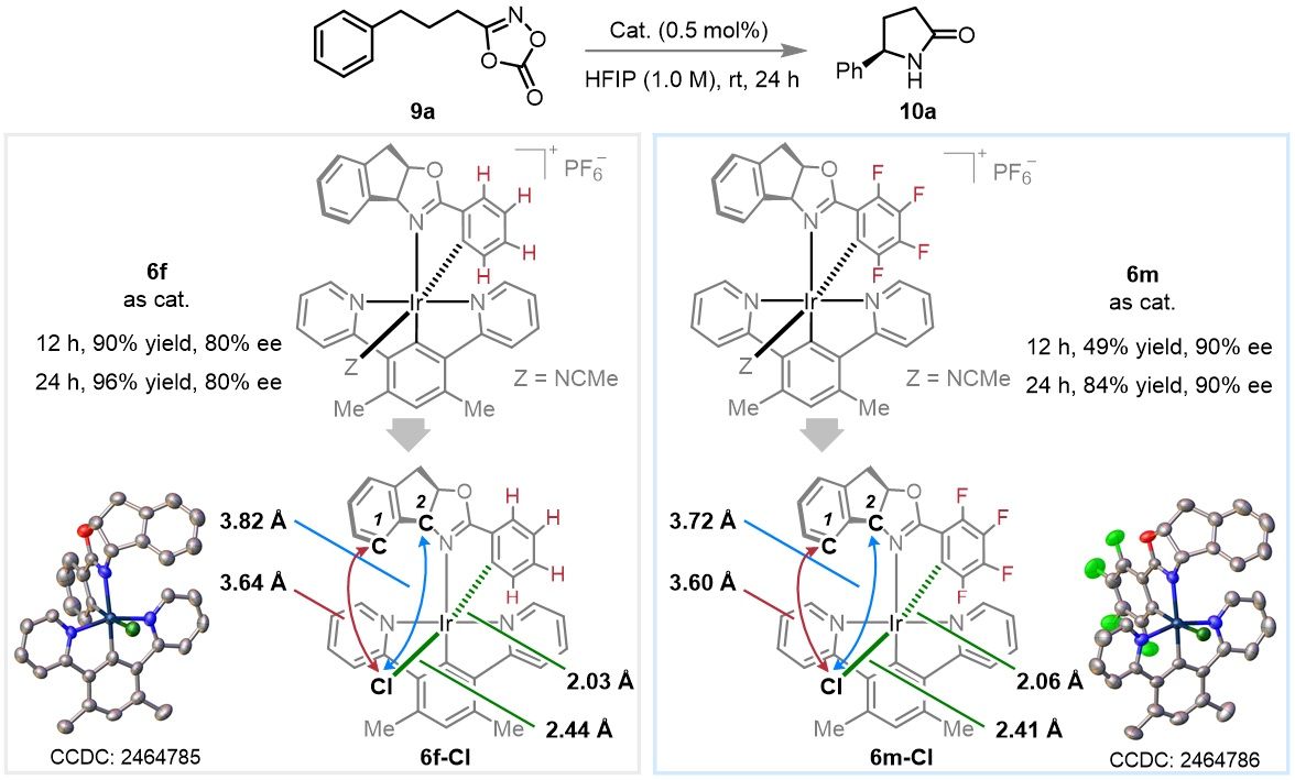 在不对称氮宾转移反应的催化剂筛选过程中,研究团队发现在环金属化双齿C^N配体中引入吸电子取代基(F和CF₃)的手性铱(III)络合物,相较于未取代的类似物,普遍表现出更优异的对映选择性控制能力。例如,铱(III)络合物6f催化生成产物10a的对映选择性为80% ee,而其四氟取代类似物6m的对映选择性则显著提升至90% ee。为探究其内在机制,研究团队对相应的氯络合物6f-Cl和6m-Cl进行了单晶X射线衍射分析。如图5所示,在6m-Cl中,Cl与C1(Cl→C1)及Cl与C2(Cl→C2)的距离分别为3.60 Å和3.72 Å,而在6f-Cl中对应距离分别为3.64 Å和3.82 Å。这一结果明确表明,引入四氟取代后,手性C^N配体的茚基部分更靠近由氯离子所占据的反应位点,从而使四氟取代的络合物6m在氮宾转移反应中实现了更优异的立体控制。从6f-Cl到6m-Cl,氯离子与茚基部分之间距离的缩短可归因于两个结构参数的改变:赤道面Ir−C键从2.03 Å延长至2.06 Å,而Ir−Cl键则从2.44 Å缩短至2.41 Å。这一现象可从以下两方面解释:首先,在C^N配体的苯环上引入吸电子氟原子,削弱了其σ给电子能力,导致Ir−C键变长;与此同时,手性配体仍与金属中心保持强螯合,使其远端茚基更接近氯离子。其次,氟取代基导致的σ给电子能力降低也减弱了反位效应,引起Ir−Cl键缩短,从而使氯离子(即反应中的活性位点)更靠近金属中心及C^N配体的茚基部分。这些结构证据共同表明,在手性C^N配体中引入吸电子基团可通过精细调控铱络合物的空间位阻和电子效应,增强铱络合物在催化反应中的立体控制能力。