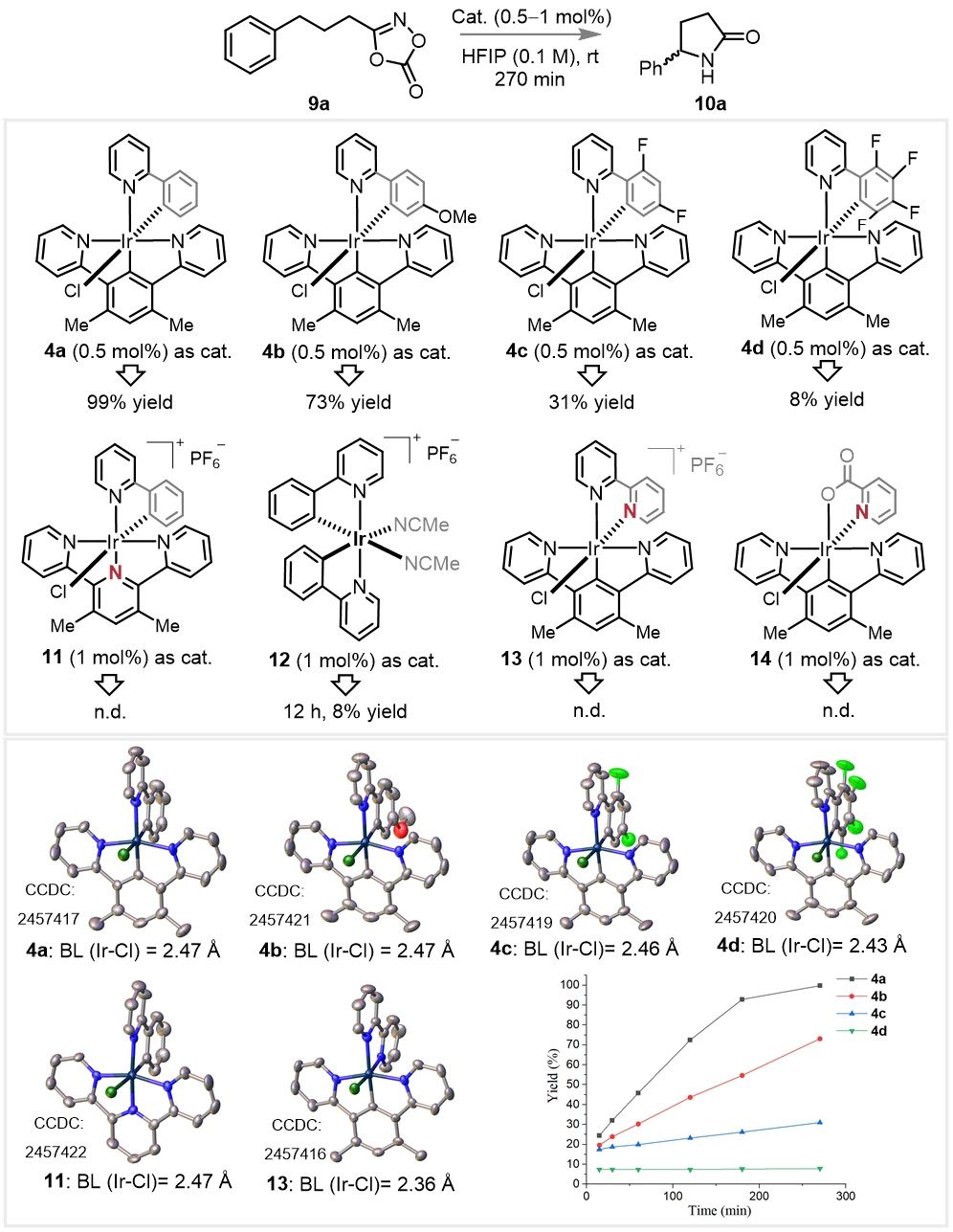 为进一步探究双齿C^N配体的电子效应对催化效率的影响,研究团队在C^N配体的苯环上引入给电子基团甲氧基(4b)及吸电子氟基团(4c、4d)。GC产率及反应动力学曲线显示,络合物4b–d的催化活性均低于4a。通过单晶X射线衍射分析发现,4a的Ir–Cl键长(2.47 Å)明显长于4c(2.46 Å)和4d(2.43 Å)。结合反位效应与反应速率之间的关联,4c和4d催化活性下降可归因于其二氟/四氟苯基σ给电子能力减弱,削弱了反位效应。此外,研究团队对含联吡啶配体的络合物13进行单晶分析,其Ir–Cl键长显著缩短至2.36 Å。综上所述,由双齿C^N配体中轴向苯基提供的的反位效应是实现高反应效率的核心因素。