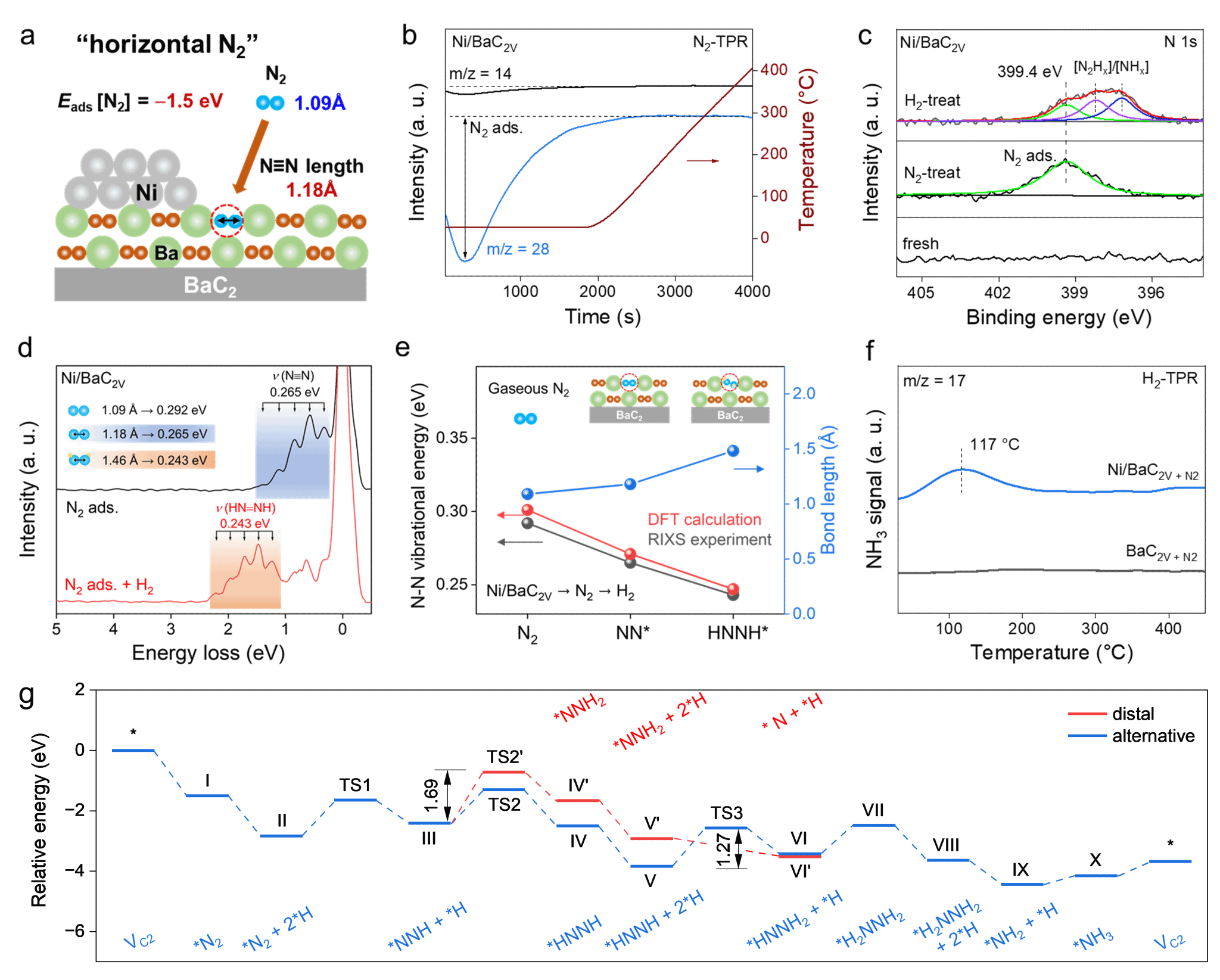 在证明了缺陷结构和电子性质之后,作者对CLAS过程进行了表征。在N2吸附阶段,通过N2-TPR(图4b)对有C2缺陷的Ni/BaC2催化剂进行N2吸附实验,观察到N2在室温下自发地吸附在催化剂表面,通过DFT计算(图4a)可得N2接收C2缺陷位点电子从而被吸附活化,吸附能为-1.5 eV,并通过XPS(图4c中)观察到在399.4 eV处产生一个明显的吸附N2的信号,RIXS(图4d黑线)也观察到了振转能级间隔为0.265 eV与吸附态N2相关的一组特征峰,并通过DFT计算(图4e)对应了“水平氮”的吸附构型。在H2通入后,XPS(图4c上)观察到与氮氢化物相关的信号,并通过RIXS(图4d红线)和DFT计算(图4e),验证了这个信号来自主要中间体*HNNH,证实了加氢过程由交替加氢的缔合路径进行。根据反应能垒计算结果可知,交替加氢路径的最高能垒为*HNNH向*HNNH2的形成(图4g),和主要中间体*HNNH相对应,优于一端加氢的反应路径(最高能垒为1.69 eV)。最后作者通过H2-TPR对比实验证明了负载Ni对H2的活化作用(图4f)。
