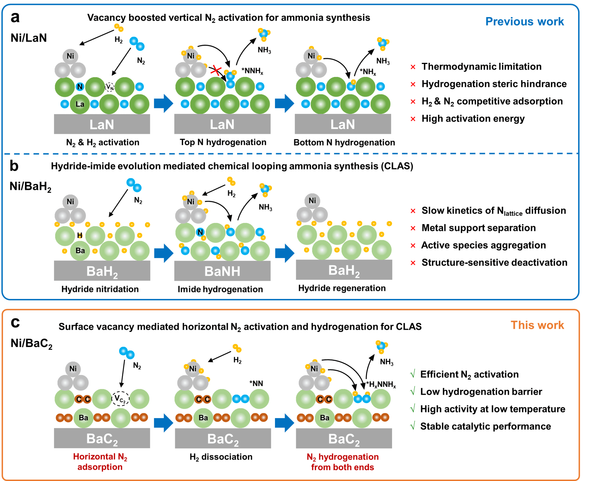 如图1a所示,常规热催化Ni/LaN催化剂中,N2被缺陷位点以端吸附构型固定活化,同时负载金属Ni活化H2,将N2与H2活化位点分开,从而通过一端加氢的缔合路径合成氨。传统CLAS中(图1b),BaH2作为储氮载体,首先与N2反应转变为BaNH,随后与H2发生反应完成反应循环并生成NH3。作者结合缺陷吸附活化N2与CLAS工艺,通过BaC2中大尺寸C2缺陷诱导“水平氮”构型活化N2,Ni上解离的氢在氢化过程中攻击吸附N2的两端,降低了反应能垒。与传统CLAS不同的是,表面C2缺陷作为反应位点规避了相转变导致的循环稳定性问题。