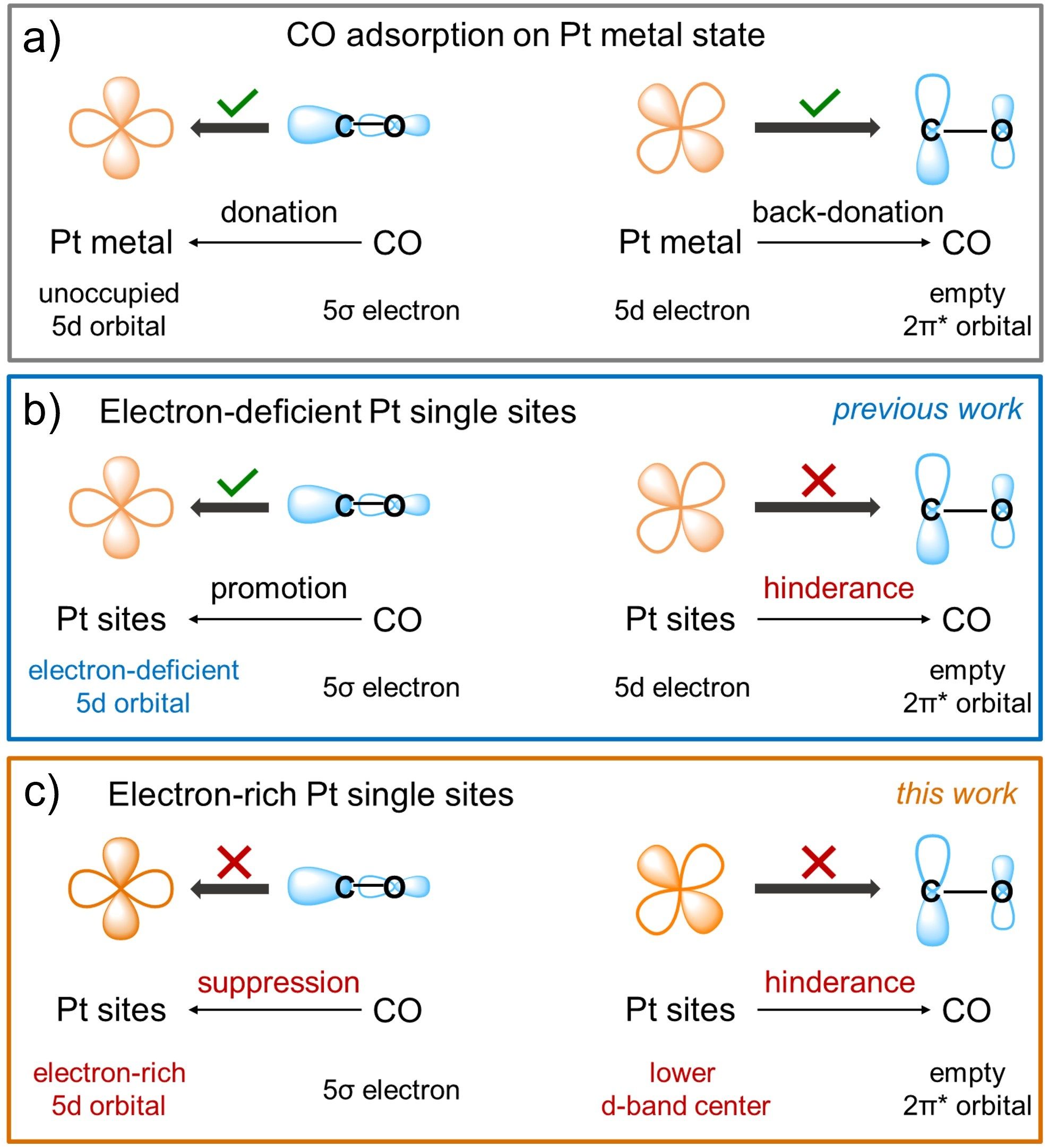 图1. 不同电子结构的Pt位点对CO的响应机制。