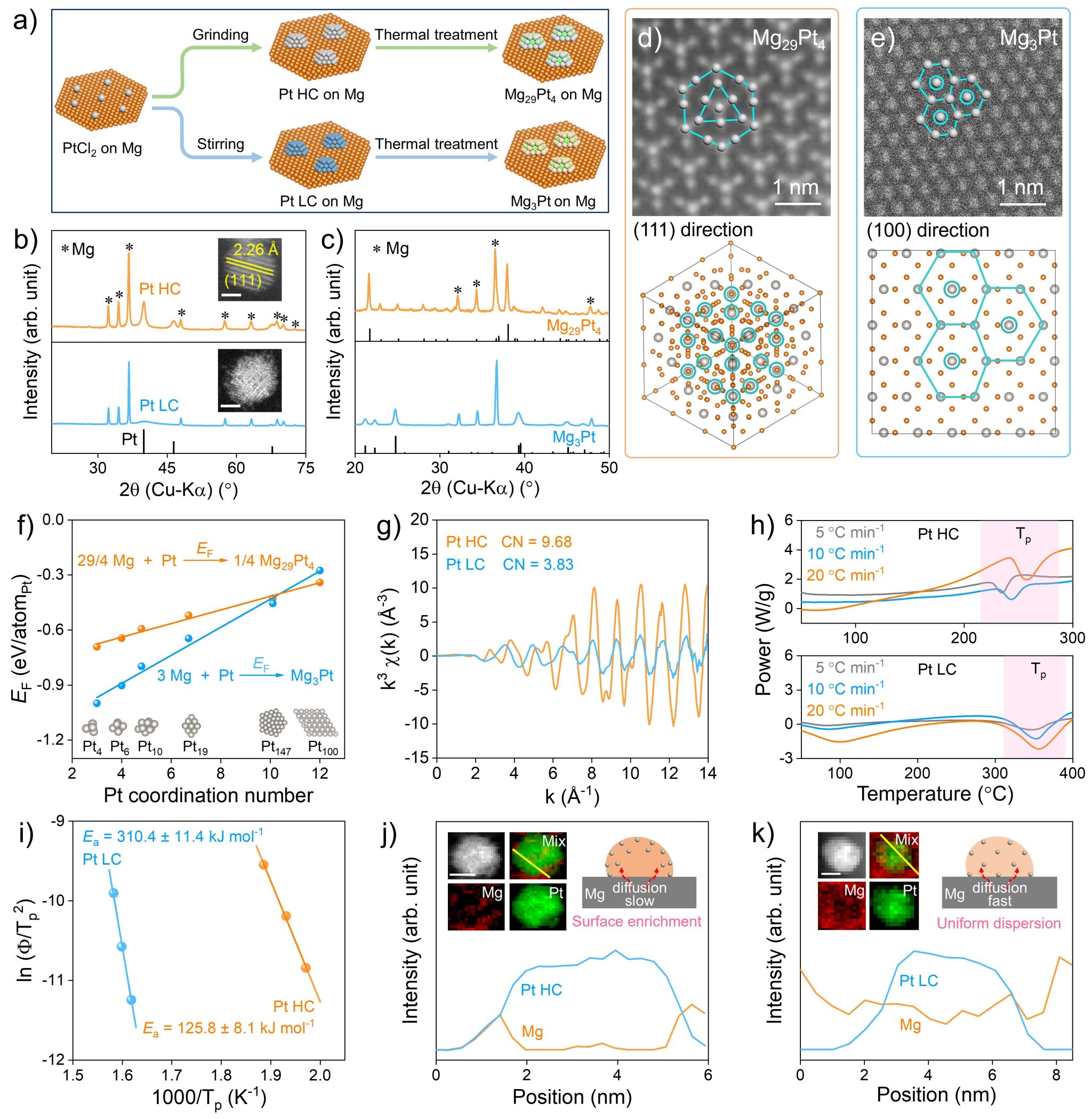 为了揭示Mg29Pt4与Mg3Pt的形成机制,作者计算了Mg29Pt4与Mg3Pt的热力学形成能(EF)随Pt配位数(CNPt)的变化关系。如图2f所示,Mg29Pt4与Mg3Pt两种材料的热力学稳定性与Pt的配位数密切有关。当Pt NPs的配位数较低时,Mg3Pt的热力学形成能低于Mg29Pt4,体系倾向于形成贫镁结构的Mg3Pt;而当Pt NPs的配位数较高时,Mg29Pt4表现出更高的热力学稳定性,此时更易形成富镁结构。图2g也证实了两种Pt NPs具有不同的配位数,其中Pt HC的配位数较高,而Pt LC的配位数较低,证实了理论计算的可靠性以及两种材料可控制备的可行性。