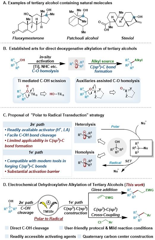 全碳季碳中心,即连接四个碳原子的碳中心,作为天然产物与药物分子的核心结构单元,因其独特的空间位阻效应与结构刚性,被证实能够显著提升药物分子的代谢稳定性及靶标结合力。因此,全碳季碳中心的构建始终是有机合成领域的研究热点。叔醇由于其易得性、化学稳定性以及丰富的天然存在形式,被视为构建季碳中心的理想前体。然而,C–OH键的高键能和羟基较差的离去能力限制了其在脱氧构建C(sp³)–C(sp³)键反应中的应用。