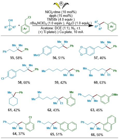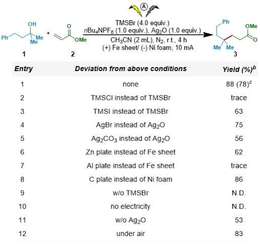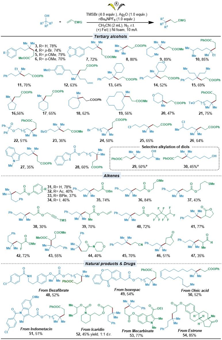 作者通过Giese型自由基加成反应来验证其设计思路,以1,1-二甲基-3-苯基丙醇(1)和丙烯酸甲酯(2)为模板底物,对反应条件进行了系统优化(图2)。最终确定以TMSBr为活化试剂,Ag₂O为添加剂,在乙腈溶剂中,采用Fe阳极,泡沫Ni阴极,在恒电流(10 mA)条件下,能够以78%的分离收率获得目标烷基化产物。控制实验证明了TMSBr、电流和Ag₂O对于反应成功至关重要。