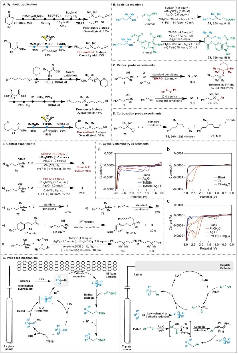 为了展示该方法在合成中的应用潜力,作者展示了规模放大合成(图5A),且可降低Ag₂O用量。同时,作者选取了两个已报道的目标化合物,运用电还原直接脱氧烷基化策略为关键步骤,以更简洁的步骤和更廉价的起始原料对其进行合成,进一步展示该方法在合成中的高效性(图5B)。为了深入理解反应机理,作者进行了一系列机理实验(图5C-F):自由基捕获实验,碳正离子探究实验,活性中间体探究实验以及循环伏安实验,验证了碳正离子到碳自由基转化的过程。