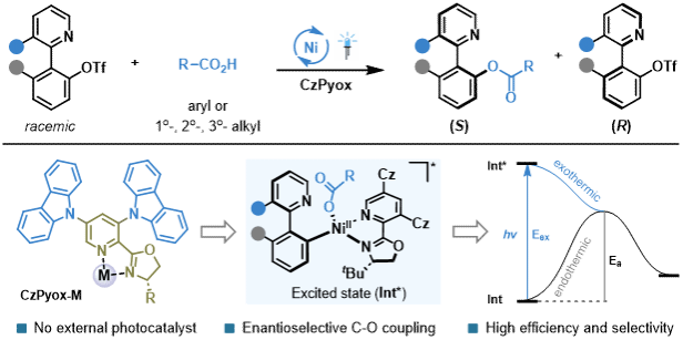 为实现上述目标,刘家旺团队基于前期在轴手性化合物合成及光催化方面的经验(Nat. Commun.2024, 15, 7248;Angew. Chem. Int. Ed.2025, 64, e202413949;ACS Catal.2025, 15, 6165;Nat. Commun.2025, 16, 9559;Angew. Chem. Int. Ed.2025, 65, e202517629; J. Am. Chem. Soc. 2025, 147, 23946),利用前面发展的新型光活性手性配体CzPyox,在无需外加光催化剂的条件下,通过动力学拆分过程实现了可见光驱动镍催化对映选择性杂联芳基三氟甲磺酸酯与羧酸的C–O偶联反应。对照实验表明将光吸收咔唑片段引入吡啶噁唑啉配体显著增强了反应效率,以优异的S值提供了多种阻转异构的杂联芳基酯,并回收了对映体富集的联杂芳基三氟甲磺酸酯原料。机理研究表明反应经历了动力学拆分过程和Ni(0)/Ni(II)/Ni(0)催化循环,配体中的咔唑基团促进了光诱导的还原消除。