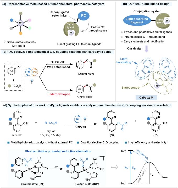 不对称光氧化还原和过渡金属协同催化已成为对映选择性构建化学键的强大平台。该催化模式将过渡金属催化独特的成键能力与光诱导电子传递或能量转移的广泛适用性相结合,可以解锁传统基态催化无法实现的新型活化模式。通常,这类转化依赖于光催化和金属催化循环之间的电子传递或能量转移过程,常常会遇到两个催化循环之间的兼容性问题。此外,在电子传递或能量转移的过程中也往往发生电子湮灭或能量耗散,导致反应效率不高。为应对这些挑战,能够捕获光能同时促进金属介导的化学键形成与断裂的双功能光活性手性催化剂吸引了广泛关注,这些催化剂不仅能够简化催化体系,而且还能实现更高效的分子内电子传递或能量转移过程。尽管已经有一些相关报道,但双功能光活性手性配体的理性设计仍然充满了未知挑战。
