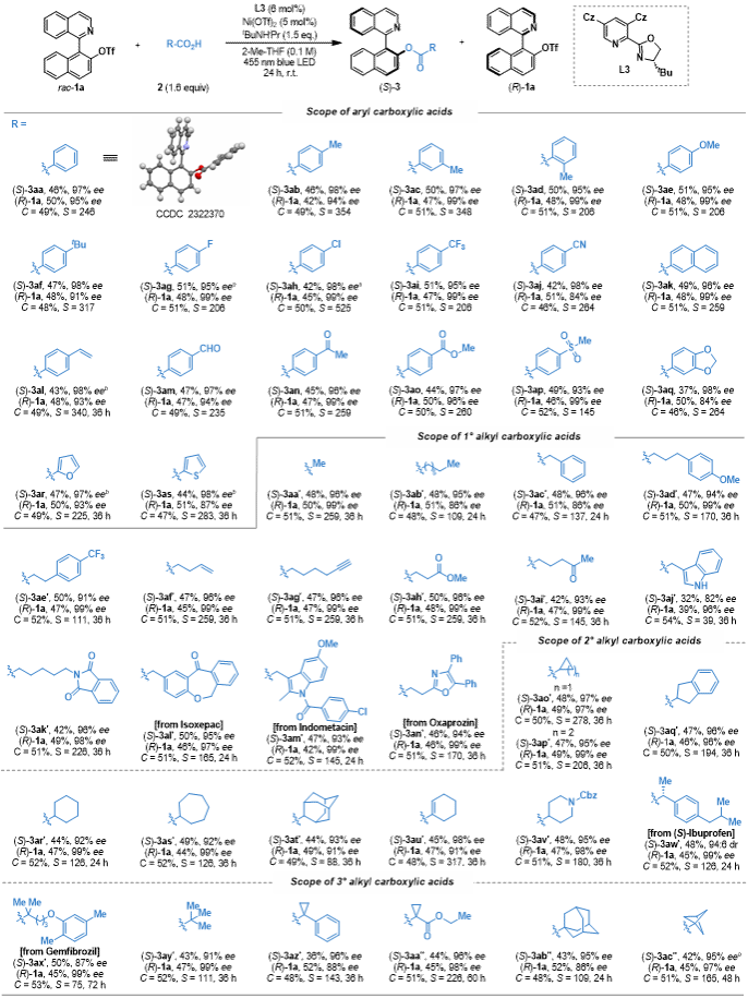 首先,基于双功能光活性手性配体设计的概念,作者通过两步反应模块化地合成一系列手性CzPyox配体。随后,这些新型CzPyox配体被应用于镍催化的对映选择性C–O偶联反应中,以消旋联杂芳基三氟甲磺酸酯化合物1a、苯甲酸2a作为模板底物,以Ni(OTf)2作为催化剂,CzPyox (L3) 为手性配体,N-叔丁基异丙胺为碱,2-甲基四氢呋喃为反应溶剂,于室温下455 nm蓝光照射24小时,即可以46%产率和97% ee得到C–O交叉偶联产物(S)-3aa,而未反应的(R)-1a以50%产率和95% ee回收。作为对照,用Pyox (L1)替换CzPyox (L3)并外加光敏剂4CzIPN提供了48%收率的3aa,但ee降至83%,并形成了大量的氢化副产物,使(R)-1a的回收率降至23%。这些结果凸显了光活性手性配体的优势,并验证了配体设计理念的可行性。