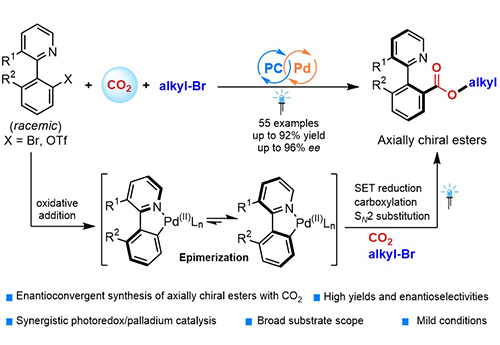 欧宝app官方网站下载刘家旺课题组Angew. Chem.: 光氧化还原/钯协同催化外消旋杂联芳基卤化物与CO2的对映收敛羧基化反应