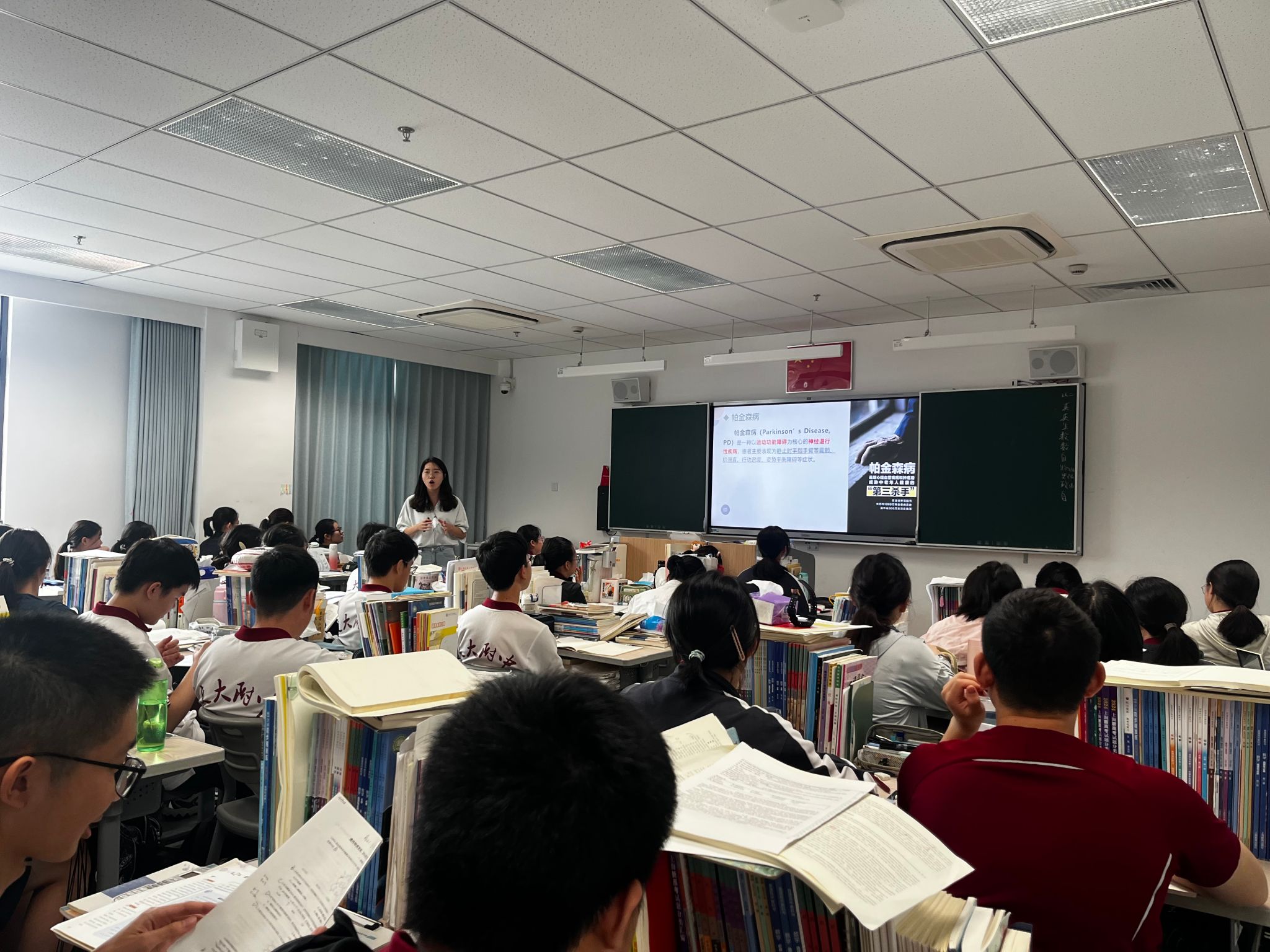 郑悦老师以必修 2 高三一轮复习“遗传信息的传递过程”为主题,巧妙地以帕金森病作为情境引入课堂。鉴于帕金森病发病与神经元溶酶体膜蛋白 TMEM175 异常有关,郑老师以此为线索展开教学。课堂上,她配合动画视频详细复习讲解了 DNA 复制、转录、翻译的过程,将复杂的遗传信息传递知识条分缕析地呈现给学生。最后,郑老师深入浅出地说明了 TMEM175 基因突变致蛋白异常,进而引发α-突触核蛋白聚积损伤神经元的致病机理。通过能感知的病症引入微观遗传原理,学生可以充分理解基因表达蛋白质这一微观现象对人体造成的宏观影响。