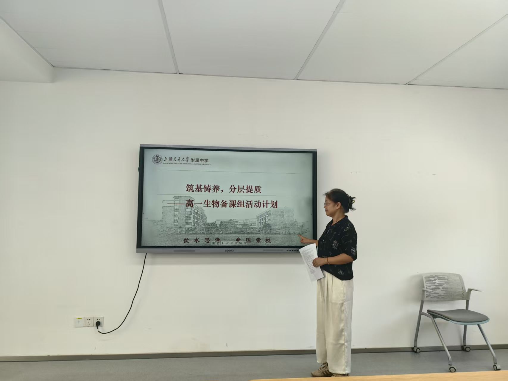 首先,高一备课组长李佳敏老师围绕新高一情况,提出了“筑基铸养,分层提质”的教学策略,其中“筑基”强调夯实学生的生物学基础知识,“铸养”强调聚焦学生生物学素养的培育,“分层”强调需要针对合格考与等级考的学生进行差异化作业设计,“提质”强调通过分层训练,让不同目标的学生都能在适配练习中夯实基础、提升能力。同时,李老师还根据自己上一轮三年的经验,提出了高一第一学期的实施方案——课堂引趣,精抓重点;练册筑基,精固根基;校本分层,精设作业;每周答疑,精解困惑;协作交流,精进共进。对于未来一学期的备课组活动展望,李老师也提到要进一步加强集体备课,围绕周豪老师开设的AI相关公开课展示进行高一专题教学研讨,并建立共享文件夹,形成资源库。