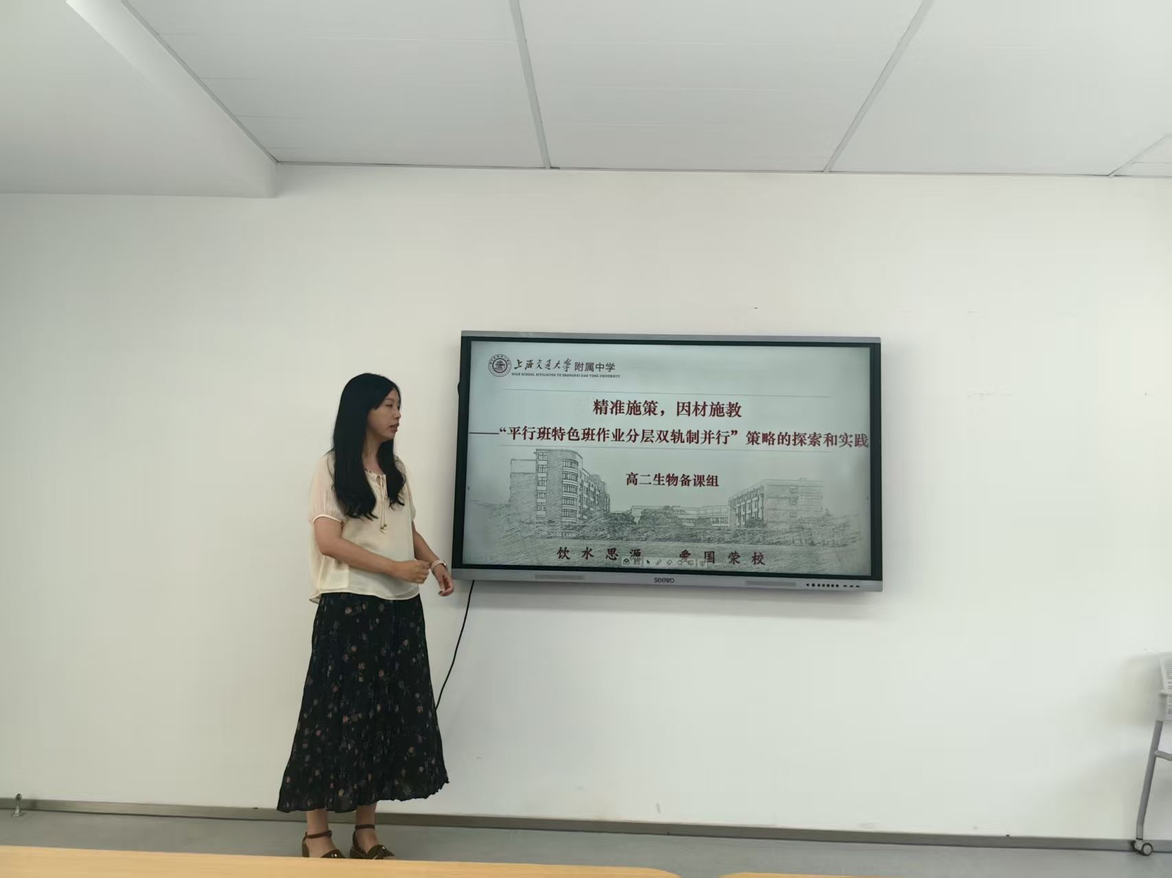 紧接着,高二备课组长赵怡珊老师介绍了高二生物备课组的一个总体规划——“平行班特色班作业分层双规并行”模型。为了更好地了解学生的想法,赵老师首先在暑期对学生进行了调研,明晰了学生希望练习中增设难题、大题的诉求。赵老师围绕四精的各个方面,介绍了备课组已经和计划实施的举措:通过优化校本,增加不定项选择,提升挑战难度以达到“精选”;平行班增设年级错题本,特色班增设每章测试卷,以此达到分层“精编”;平行班全批全改,特色班注重简答题的批改,以此达到“精改”;利用暑期录制讲解视频,侧重解答学生的疑惑以此达成“精评”。同时,赵老师也提到对于平行班、特色班分层双规,不要遗忘在其中搭建合适的弹性通道,给学生提供随时向上的动力。