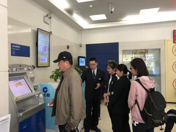 2018年4月15日下午,在常妮老师的带领下,JA学生公司社长陆奕滢携社员们来到与JA学生公司建立长期合作的三门路建设银行支行进行实践与观摩活动。