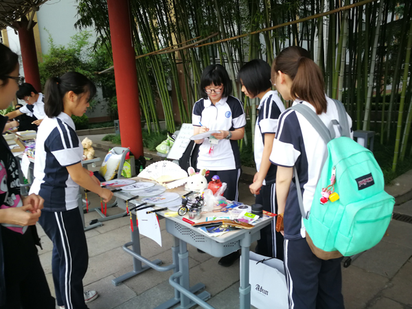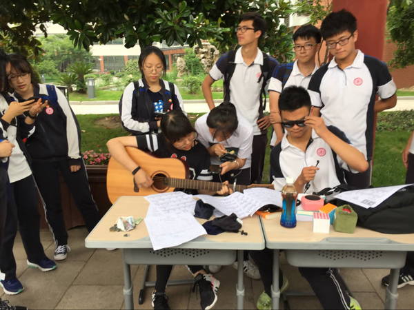 从四点到六点的两个多小时里,同学们摆上琳琅满目的小物件,现场歌唱、演奏、绘画,尽情展示各班的风采。沿着整条长廊走去,叫卖声与欢笑声不绝于耳。每个班都创意翻新,不少班级把独特的个性化融入义卖活动当中,令人眼前一亮。吹、拉、弹、唱、书法、绘画、舞蹈、变装……在售卖小商品之余,各班多姿多彩的特色也让人眼花缭乱。