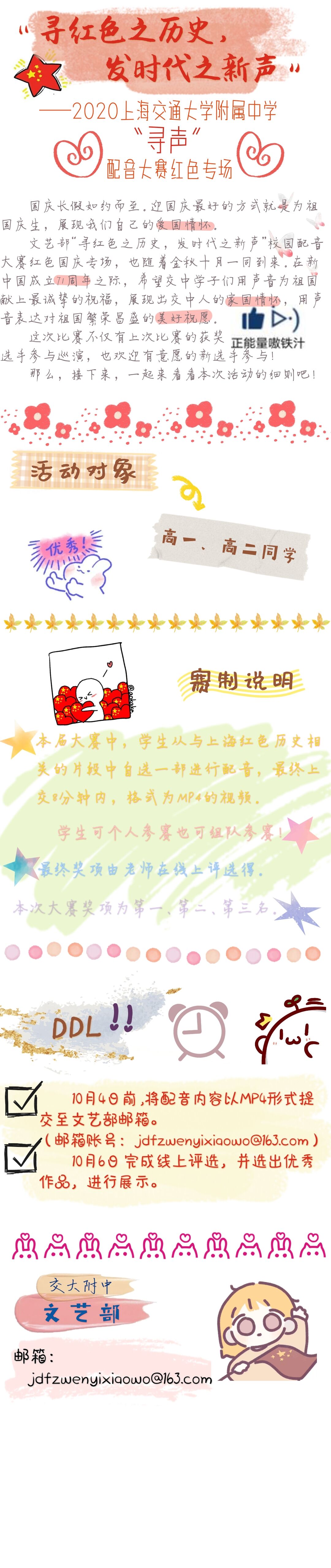 交大附中在文学艺术活动方面有许多特色。以“以声传情,此声难忘”为主题的“寻声”影视作品配音大赛是由我校模拟社区文艺部举办的独具特色的活动。在活动中,同学们自选影视作品片段进行配音与展示。活动集文学鉴赏,配音,视听,视频剪辑于一体,极大地考验着学生的综合能力。在活动中,参赛选手们高超的鉴赏艺术令评委们叹服,他们惟妙惟肖的声线让观众们身临其境,他们一流的声音技艺让所有人感受到了声音的雄奇力量。活动不仅呈现出了交中学子的多才多艺得个人能力,更让文艺精神在校园里流淌,让“爱影视 会欣赏 懂艺术”的文学精神深入到每一位交中学子心中。