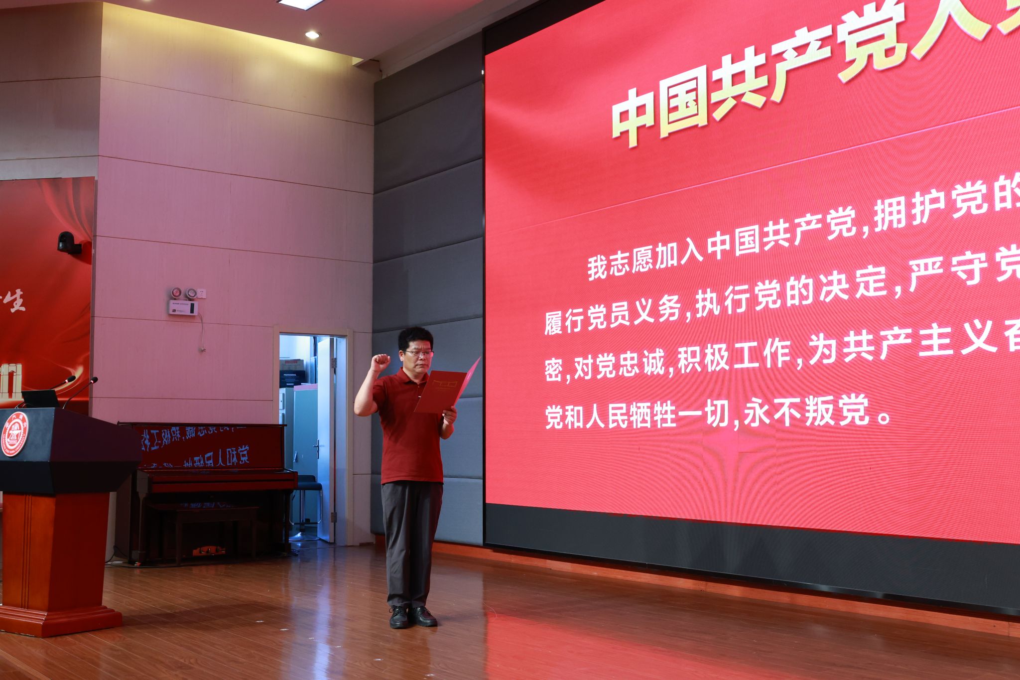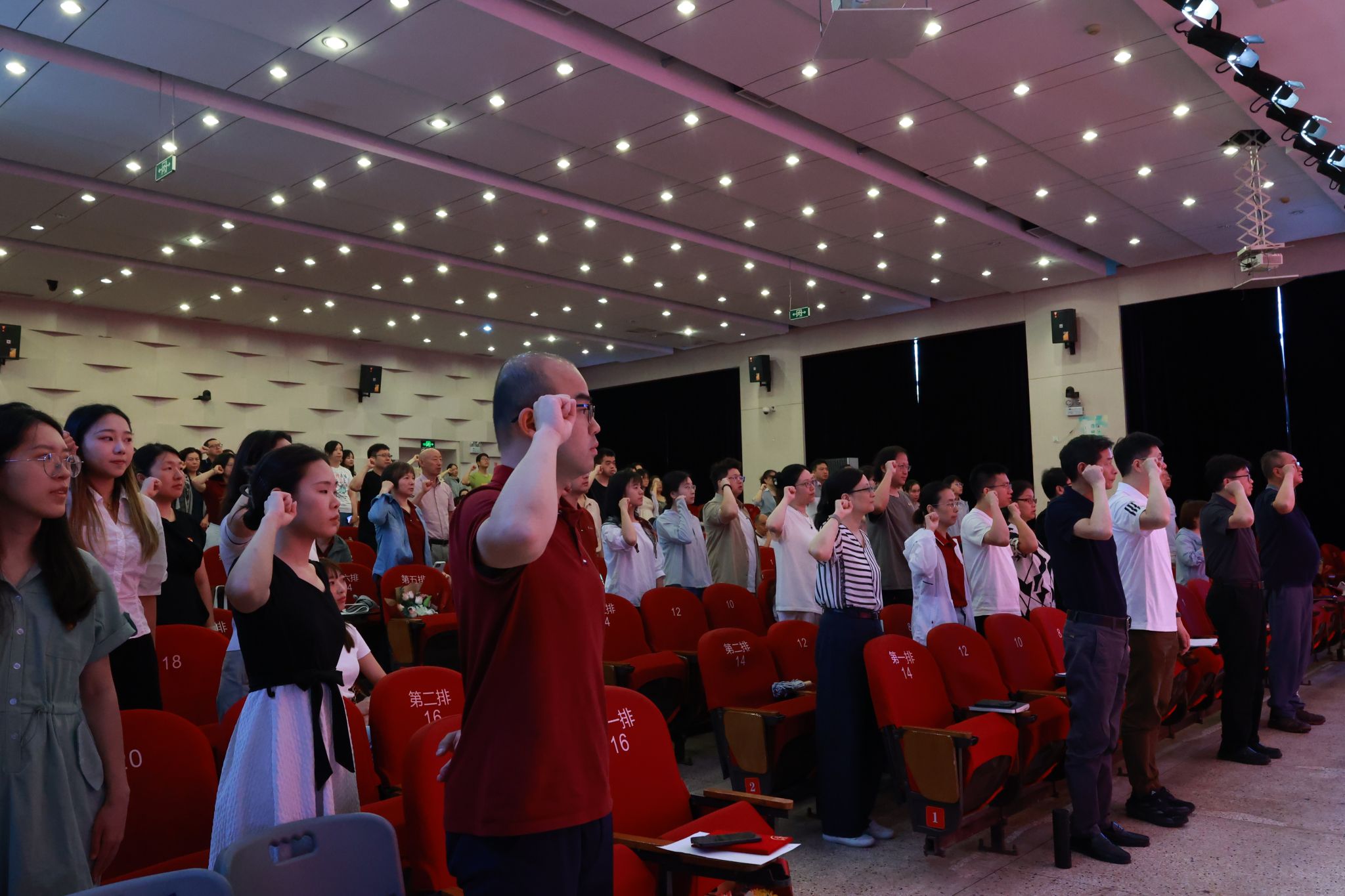 在特级教师、正高级教师的沈桂弟党员老师的带领下,吴思凡、潘远真、麦尔旦三位新党员面对党旗庄严宣誓。全体党员重温入党誓词,铿锵誓言响彻会场。