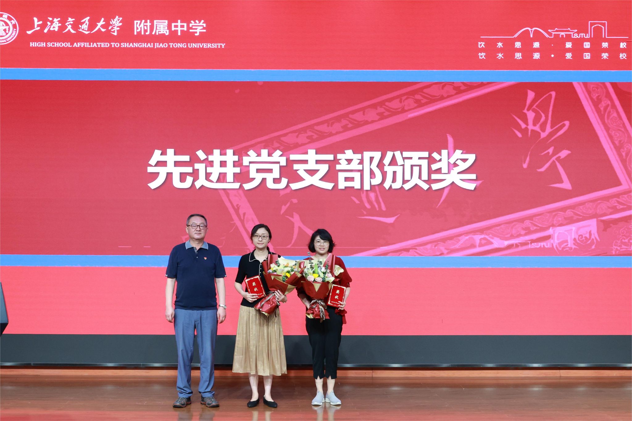 英语党支部、化学党支部获评“先进党支部”,英语党支部书记秦亮老师、化学党支部书记孙世云老师上台领奖,党委书记徐向东为获奖支部颁奖。