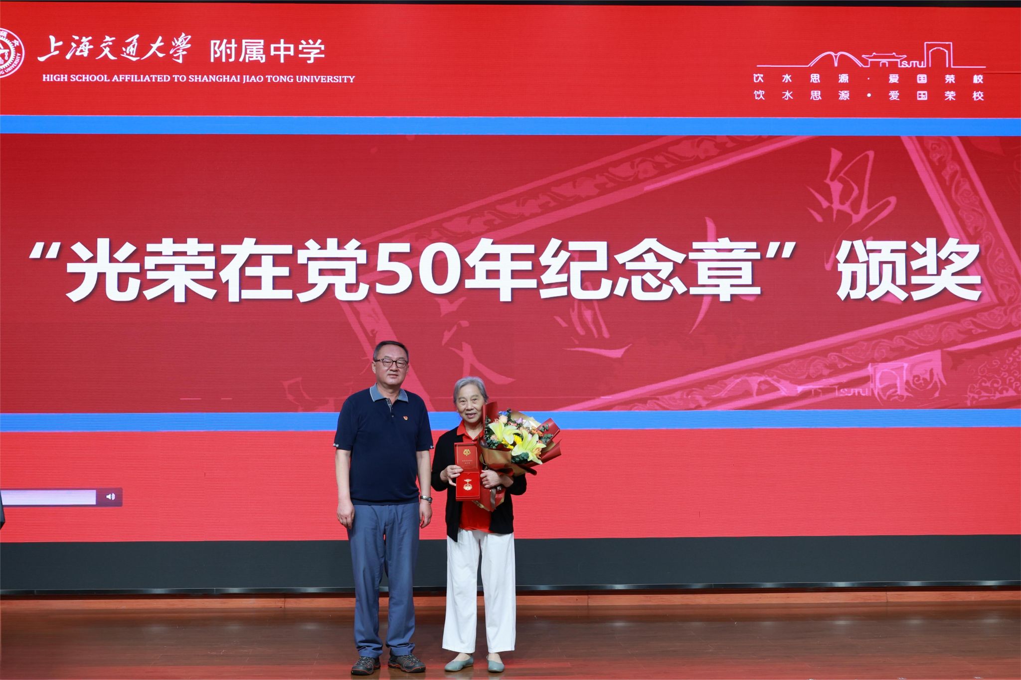 传承荣光,铭记初心。退休党员教师胡菊梅老师、蒋和庚老师获“光荣在党50年纪念章”。胡菊梅老师现场接受徐向东书记颁发的纪念章。