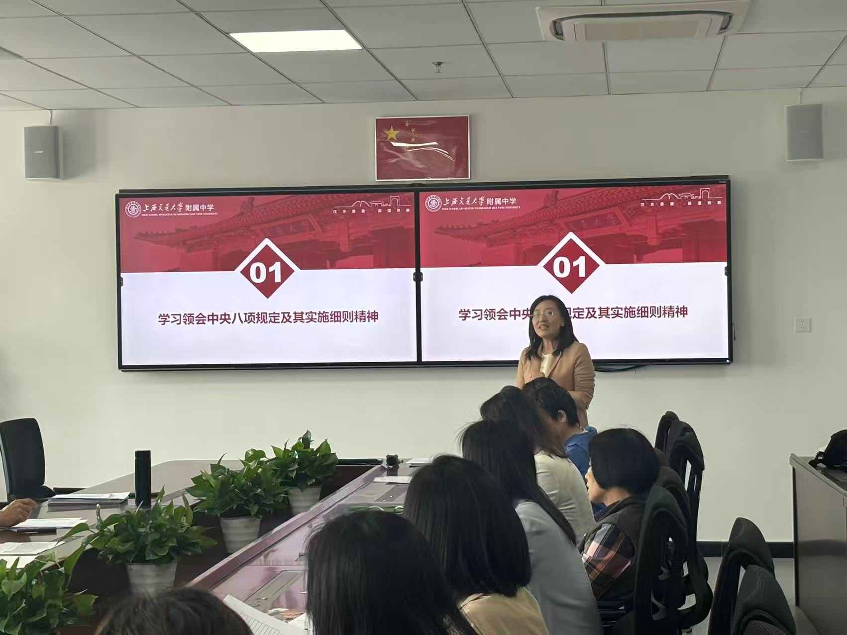 会议伊始,金怡老师组织大家共同学习了习近平总书记2025年3月在云南和贵州的讲话,习近平总书记指出党中央决定在全党开展深入贯彻中央八项规定精神学习教育,这是今年党建工作的重点任务。