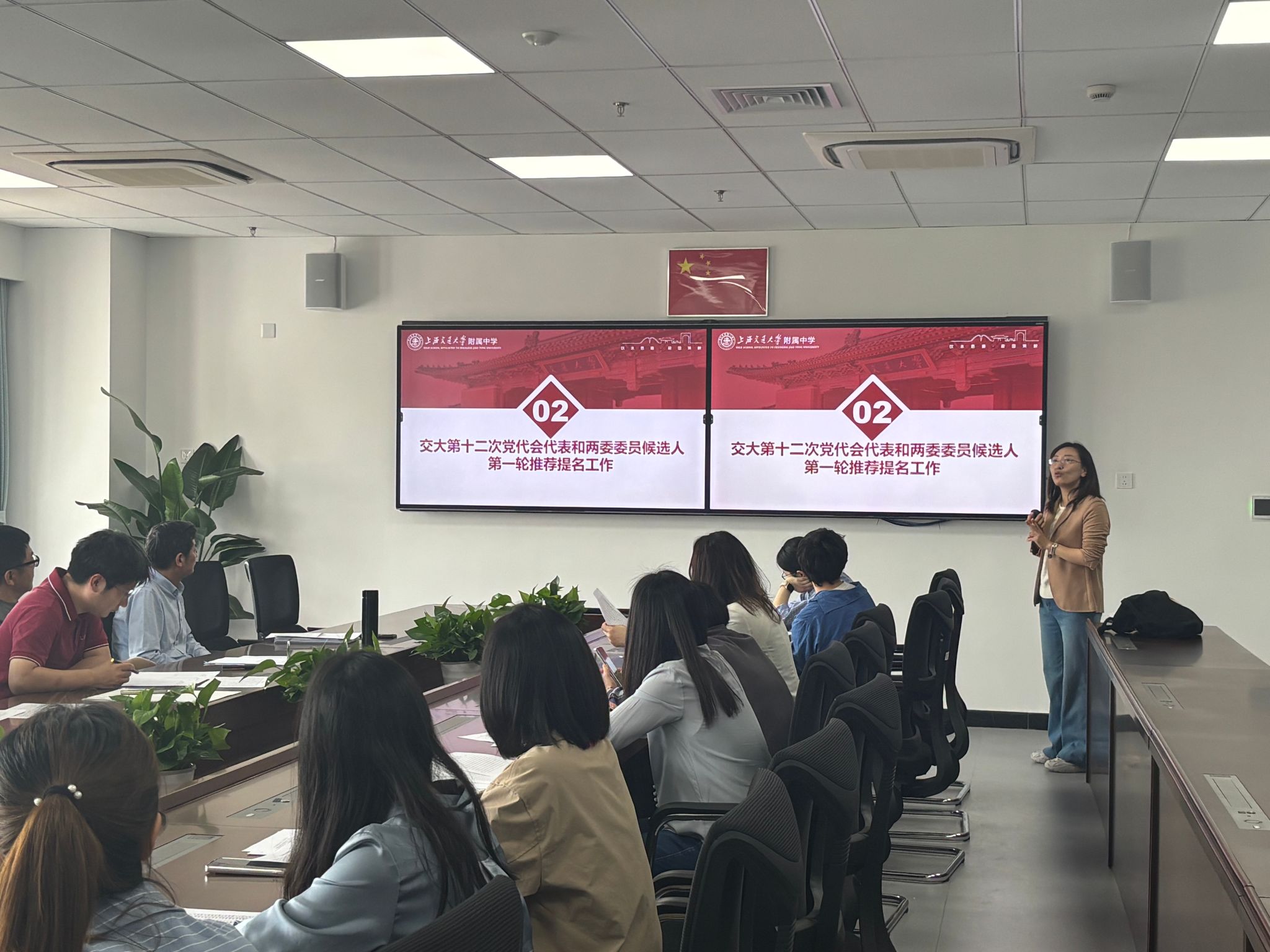 随后,进行交大第十二次党代会代表和两委委员候选人第一轮推荐提名工作。金怡老师首先传达了关于代表选举和"两委"委员候选人推荐提名工作的具体要求,强调了此项工作的重要意义和纪律要求。与会党员以高度负责的态度,严格按照推荐提名条件和程序要求,进行了民主推荐。