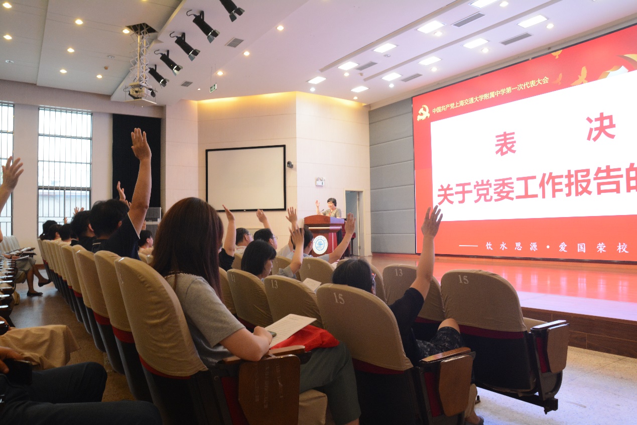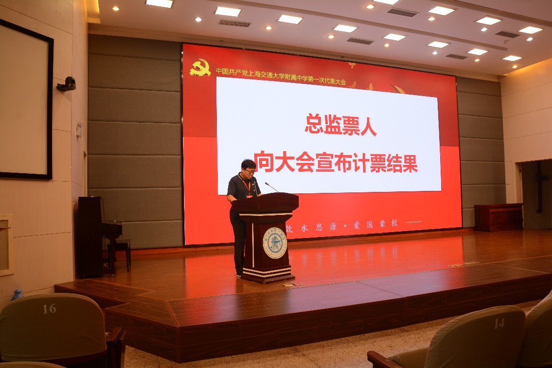 下午3时30分,选举大会正式开始,交大附中副校长胡杰主持会议。大会首先表决通过大会选举办法及总监票人、监票人名单。然后,进行第一届党委委员选举。16时20分许,选举大会复会,总监票人李可锋同志向大会报告计票结果。大会主持人胡杰宣布选举结果。按姓氏笔画排序,万晓玲、刘骁、范红凤、胡杰、顾岗、徐向东、曹建华、曾国光、黎冀湘当选为中国共产党欧宝app官方网站下载附属中学第一届委员会委员。