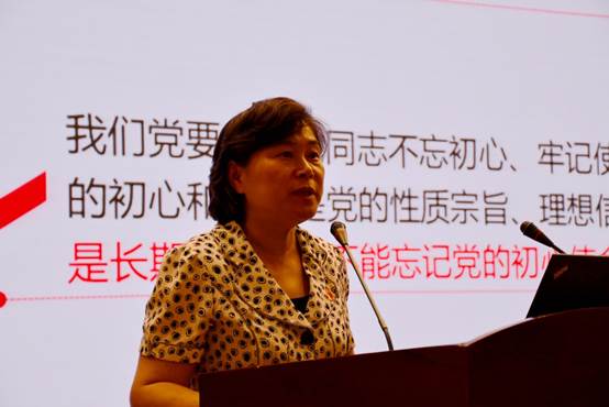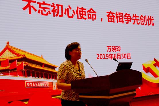 庆祝大会最后,校党委书记万晓玲同志以“不忘初心使命,奋楫争先创优”为主题进行专题讲话。