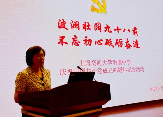 2019年6月30日下午1点,上海交大附中庆祝中国共产党成立98周年纪念活动在报告厅隆重举行,党员和全体教职员工参加了庆祝大会。大会由校党委书记万晓玲同志主持。