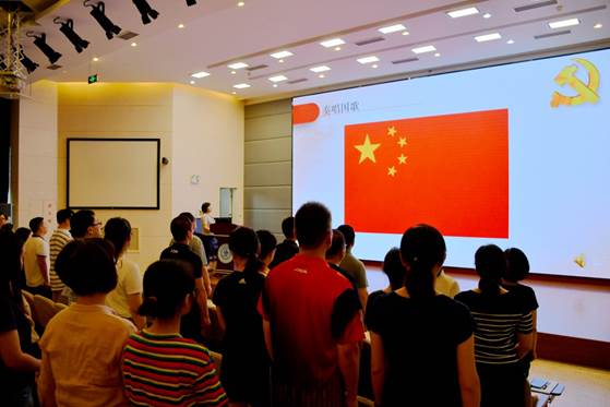 伴随着国歌的奏响,庆祝大会拉开帷幕。全体党员和教职员工齐唱中华人民共和国国歌。