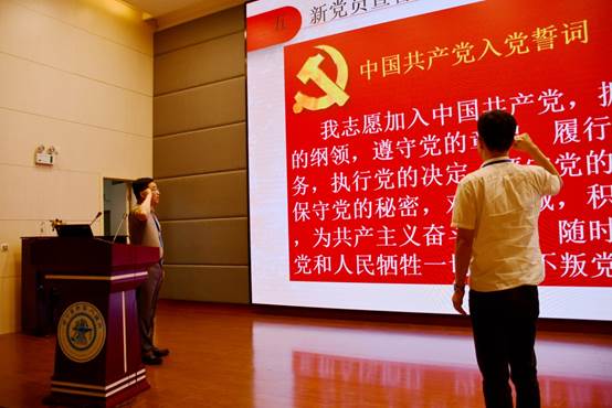 两位老师的交流发言之后。校党委委员、副校长胡杰同志带领新党员教工陆栋梁同志进行党员宣誓,全体老党员重温入党誓词。