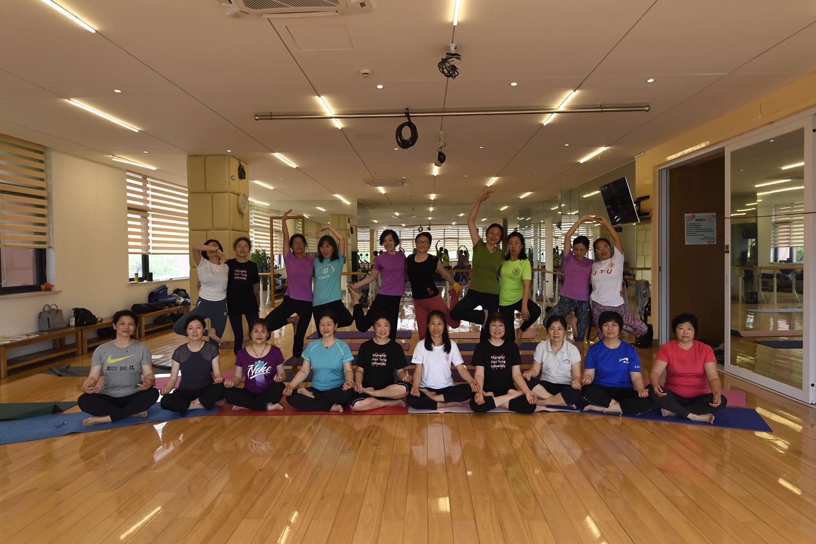 随着“让我们盘坐在垫面上,轻轻地闭上眼睛,下巴微微往里收,一起发出三声悠长的OM“口令,开始今天的练习。本次活动挑选了老师们熟悉的两套“蕙兰瑜伽“,从“手抱膝功”与“弯腰三角功”活动脚趾与脚踝、伸展手臂与背部的经典姿势开始,中间通过树式、骆驼式,到“扭脊梁功”、“向前弯身功”等等姿势,随着舒缓的音乐,一招一式大家都是认真努力和勤奋付出,专注身体的感受,用心去吸气和呼气。不大一会儿,就全身冒汗。老师们用汗水来雕刻自己的身体,修复心灵,感到无比舒爽与通畅。之后,大家再接再厉,继续下一套蕙兰瑜伽练习。
