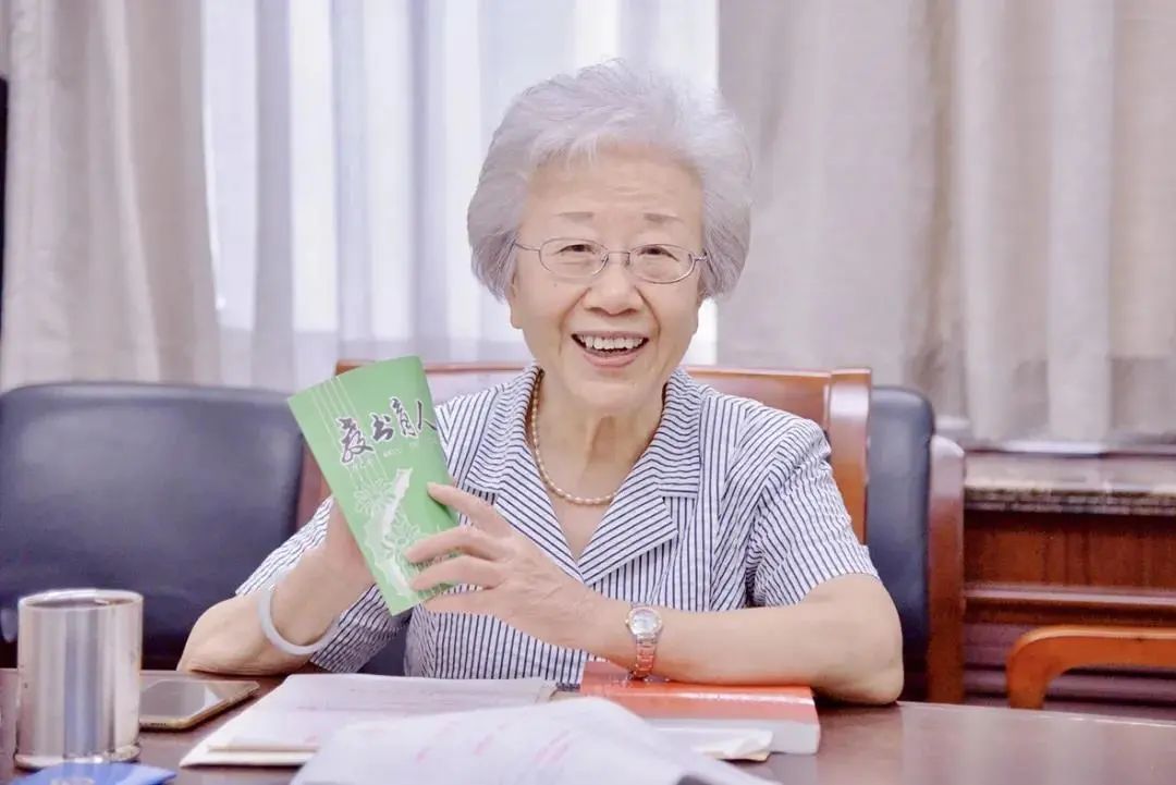 毛杏云手执《教书育人》小册子,介绍数学系中优秀教师的典型事迹