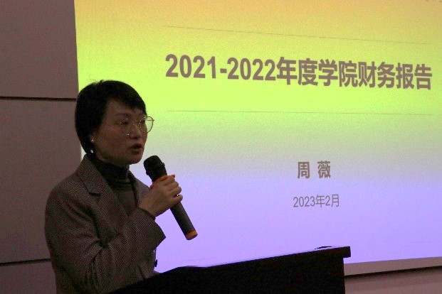 学院党委书记周薇向大会作《船建学院财务工作报告》,介绍了2021-2022年学院总体收支情况、预算执行情况和2021-2022年财务重点工作。她表示学院将继续充分发挥财务支撑保障作用,积极筹措资金,合理配置资源,保证重点工作,优化师生服务,确保学院各项事业平稳健康发展。