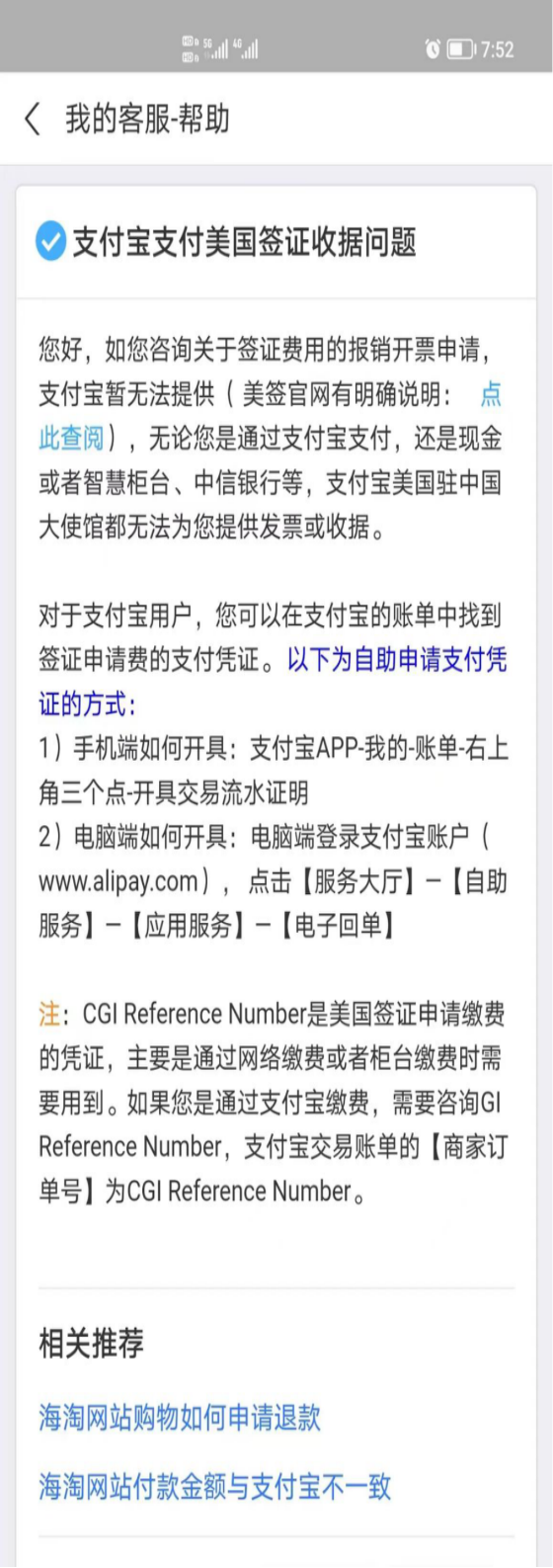 2、若签证费用使用支付宝支付,发票开具方式如下: