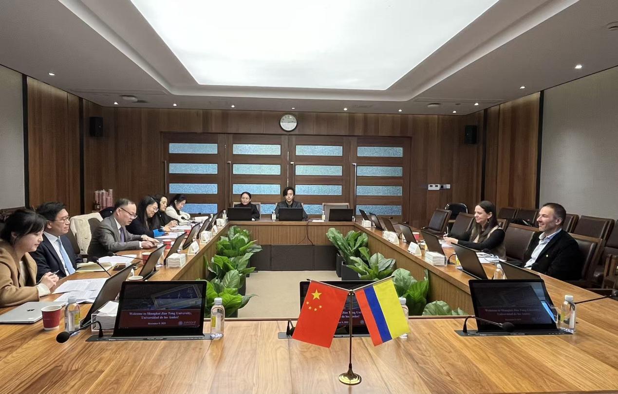 Representatives from the Office of International Cooperation and Exchange, Global College, School of Design, and Colombian students at SJTU attended the meeting.