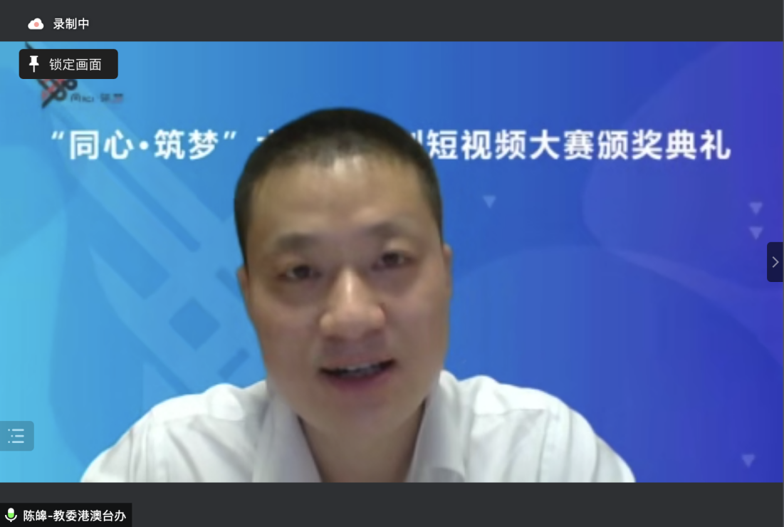 颁奖典礼上播放了来自北京大学“双城男室友们”团队的特等奖作品《我的中国故事——做一个用歌声讲故事的人》。作为队长的江阳同学在发言中表示,在作品制作过程中,他与团队成员一次又一次碰撞出的思想火花让他深刻感受到了香港青年与内地青年在文化传承、使命担当上的一致性。作为中国香港学生,能够通过视频的形式、发挥专业所长讲述自己的故事、表达对祖国的热爱,他十分荣幸。在今年香港回归祖国25周年之际,他也将继续通过歌声表达对回归的激动心情,用歌声唱出新时代中国青年的好声音。