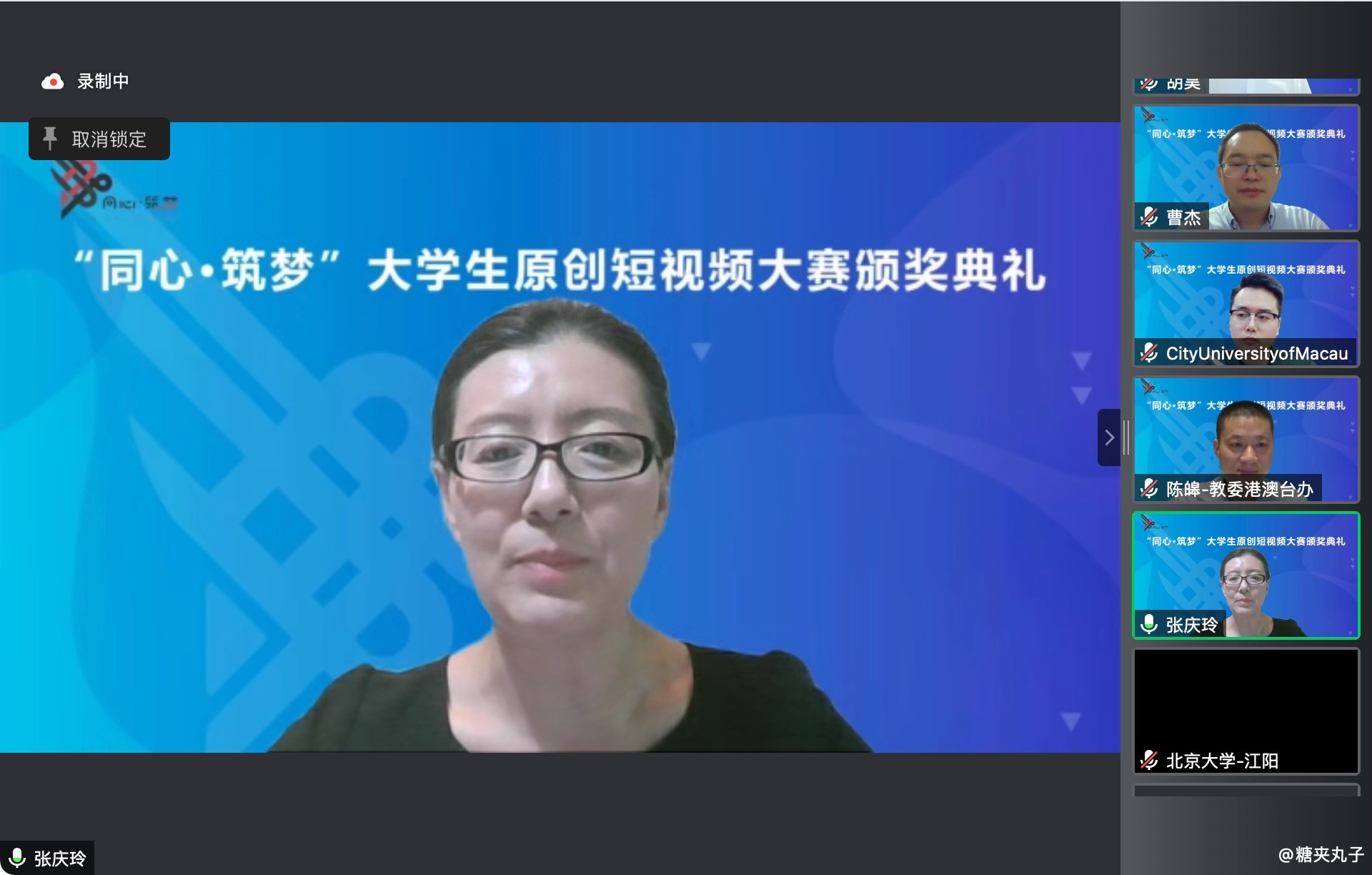 随后,张庆玲代表专家评委进行发言,她表示本次大赛通过短视频的方式为我们呈现出不一样的青春中国,不仅提高了青年一代对中华文化的认同感,同时也增加了同胞手足情深的情感共鸣。通过视频,不仅感受到了他们的温情、发掘到了那颗炙热的“中国心”,她也希望比赛这个桥梁能够长久持续地搭建。