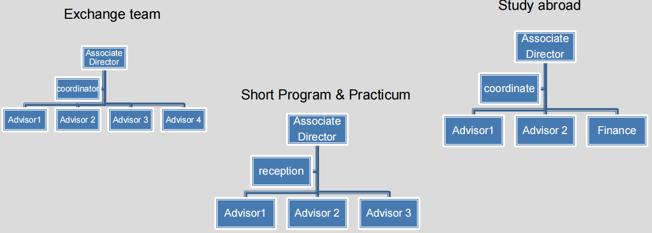 国际学生发展部有部门主管管理,下设五个国际学生顾问,负责工作坊、系列课程、一对一辅导等事务;两个澳洲政府奖学金生负责人,主要负责奖学金生工作;一个项目运营官员,主要负责对学生的宣传、学生组织、新生指南等;一个IT协调员,主要负责数据统计、上传签证相关数据等工作;一个行政官员,主要负责行政事务。