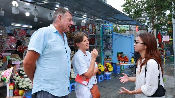 在昆岛街头,针对越捷航空湿租C909飞机并开通昆岛航线对当地的交通、居民生活和旅游业的影响,项目组成员在昆岛街头开展采访调研。“中国飞机的舒适度超出预期”,一位刚体验过C909的法国游客的反馈,让团队成员倍感振奋。