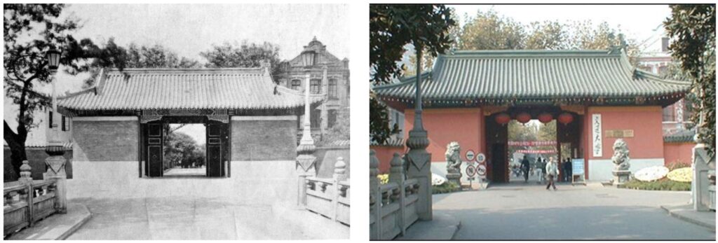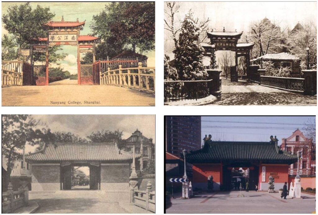 交大校园的校舍建筑采用的几乎都是西方建筑样式,唯独校门的样式一直都保持正统的中国样式,这可能有两个原因。(1)体现这是中国人自己创办的学校。校门外正对的华山路的另一侧就是法租界,徐家汇三条主要河道之一的法华泾流经学校门口,使交大校园与外界之间形成一条天然的地理分界线。当时学校选择在这样的一个位置建造校门当然也是有这方面的考虑,希望能够在外国人的面前树立起中国人的自信。(2)体现了创办者“中学为体,西学为用”的思想。“中体西用”是洋务派教育的根本指导原则,盛宣怀在办学时始终贯彻“中体西用”的办学原则。在比较了先期创办的北洋大学之后,他们认识到虽然北洋大学的学生对其他学科掌握的很好,“但是他们当中有许多人却不会写简单的汉语作文,而且对中国文学毫不熟悉”,因此在新学院的办学目的中更强调了对中文的要求,“只招收那些经过严格中文考试合格的学生”,并在学校的教学中强化汉语的学习。何梅生先生更是指出“将这种教育(西方现代学科的教育)传授给能够用规范的语言表达新思想的人们,而现代学科将很容易变成更为广泛的文化的真正组合部分”。