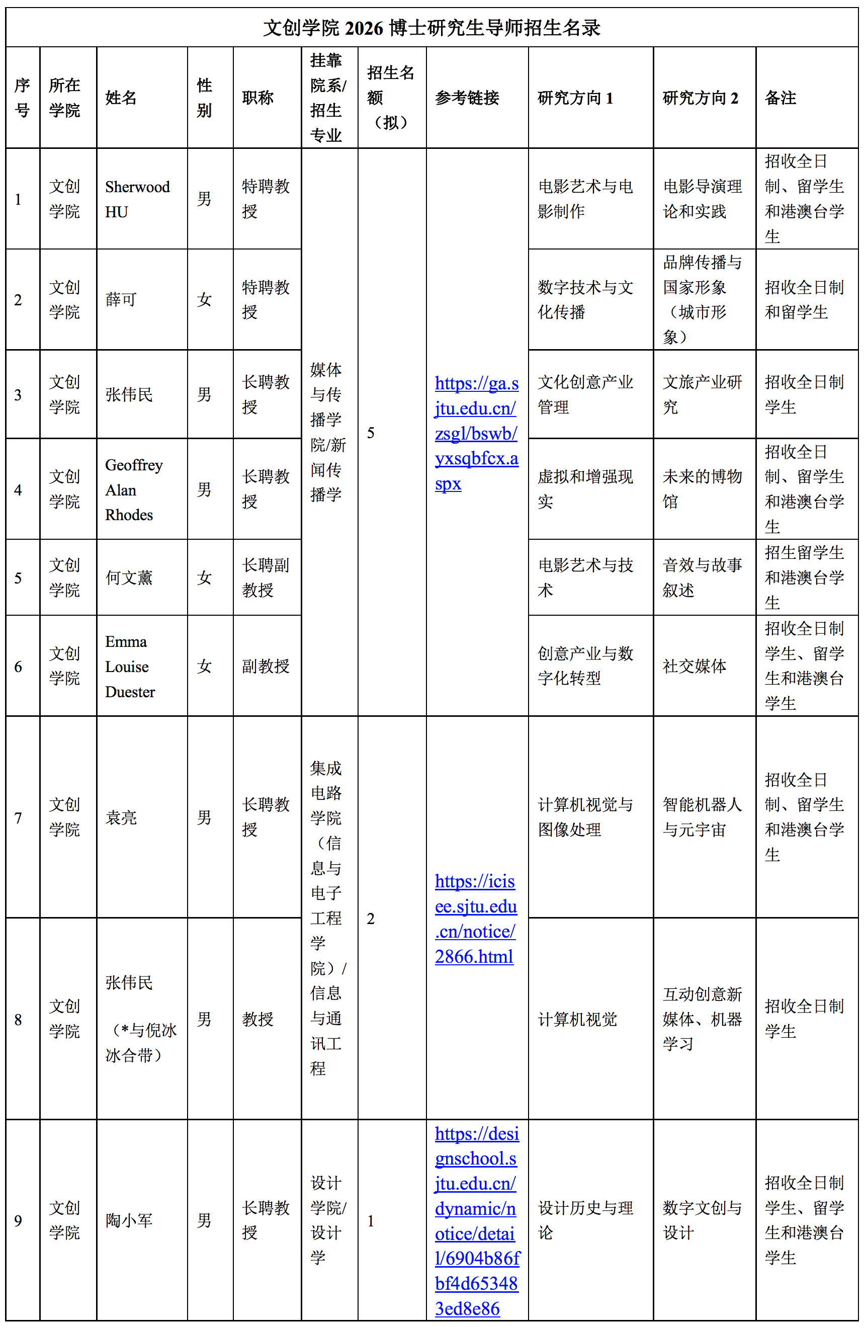 2026年学院博士生招生名额为8名,其中挂靠媒体与传播学院的名额拟为5名,挂靠集成电路学院(信息与电子工程学院)的名额拟为2名, 挂靠设计学院的名额拟为1名。