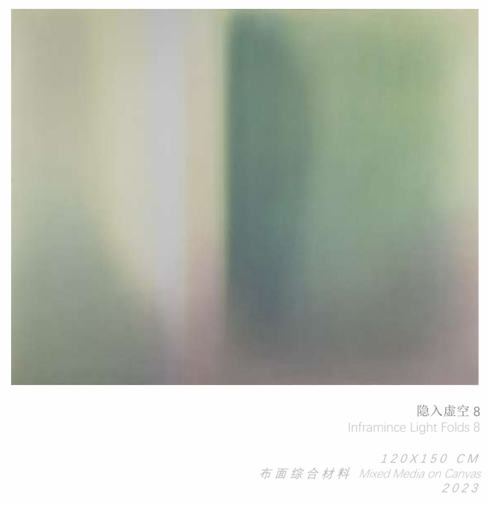 In *Ambiguous Spaces*, light takes center stage, returning painting to its essence. Xia Kejun, professor at Renmin University of China and philosopher, remarks: "This is where Huang’s painting begins—returning to the ultimate 2D plane, as light projects directly, leaving fleeting faint traces." The interweaving of light and mist creates an atmosphere of "familiar yet strange", with flowing light folds cutting through the spiritual realm and probing possibilities beyond cognition.